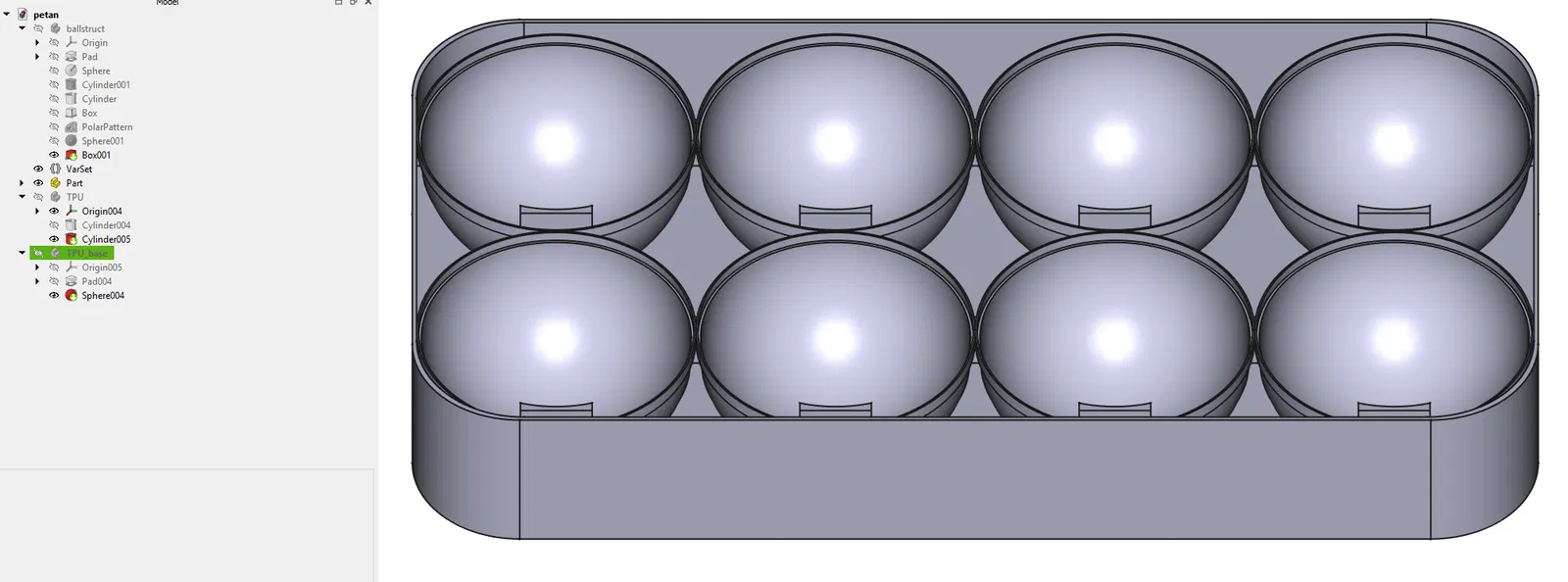 Hộp đựng thiết kế parametric cho 8 quả bi petanque, tích hợp đệm giảm chấn TPU giúp bảo vệ bi tốt hơn. Thiết kế phần đáy, không nắp, đã được kiểm chứng với bi kích thước 73mm sử dụng chất liệu in PLA và TPU.