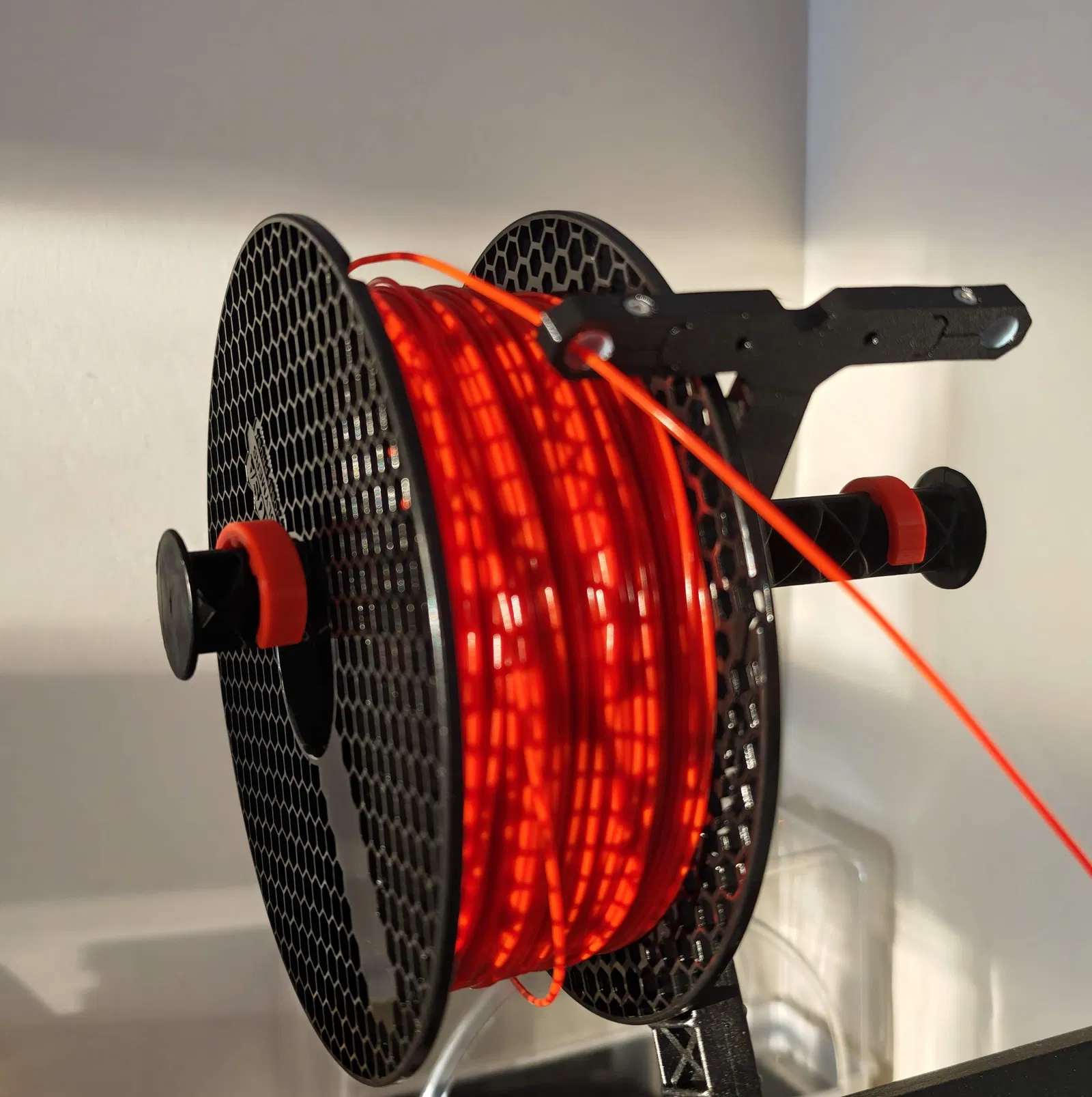 Để đạt hiệu quả tốt nhất, bạn nên in kẹp bằng nhựa PETG với cài đặt mặc định của Prusa (chiều cao lớp 0.2 mm, mật độ in 25%, không cần dùng support). Các kẹp này có thể điều chỉnh vị trí theo từng nấc 5mm dọc theo thanh giữ để phù hợp với nhiều kích thước cuộn khác nhau. Bạn chỉ cần kẹp chúng ngay phía sau cuộn nhựa, chừa lại một khoảng nhỏ để cuộn có thể xoay tự do.
