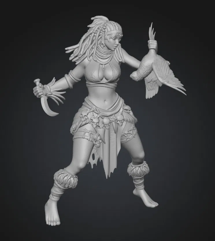 Mô hình "Bloodfeather Huntress" là một tác phẩm nghệ thuật kỹ thuật số đầy ấn tượng, khắc họa hình ảnh một nữ chiến binh bộ lạc dũng mãnh và đầy bí ẩn. Với tư thế chiến đấu mạnh mẽ, cô đang tay cầm con dao găm cong sắc bén cùng một con chim săn được, thể hiện rõ nét kỹ năng sinh tồn tuyệt đỉnh giữa thiên nhiên hoang dã. Đây là mẫu mô hình lý tưởng cho những ai đam mê thể loại game nhập vai (RPG), board game hoặc những người yêu thích sưu tầm các mô hình nhân vật độc đáo để trang trí hoặc phục vụ cho các buổi chơi game tabletop.