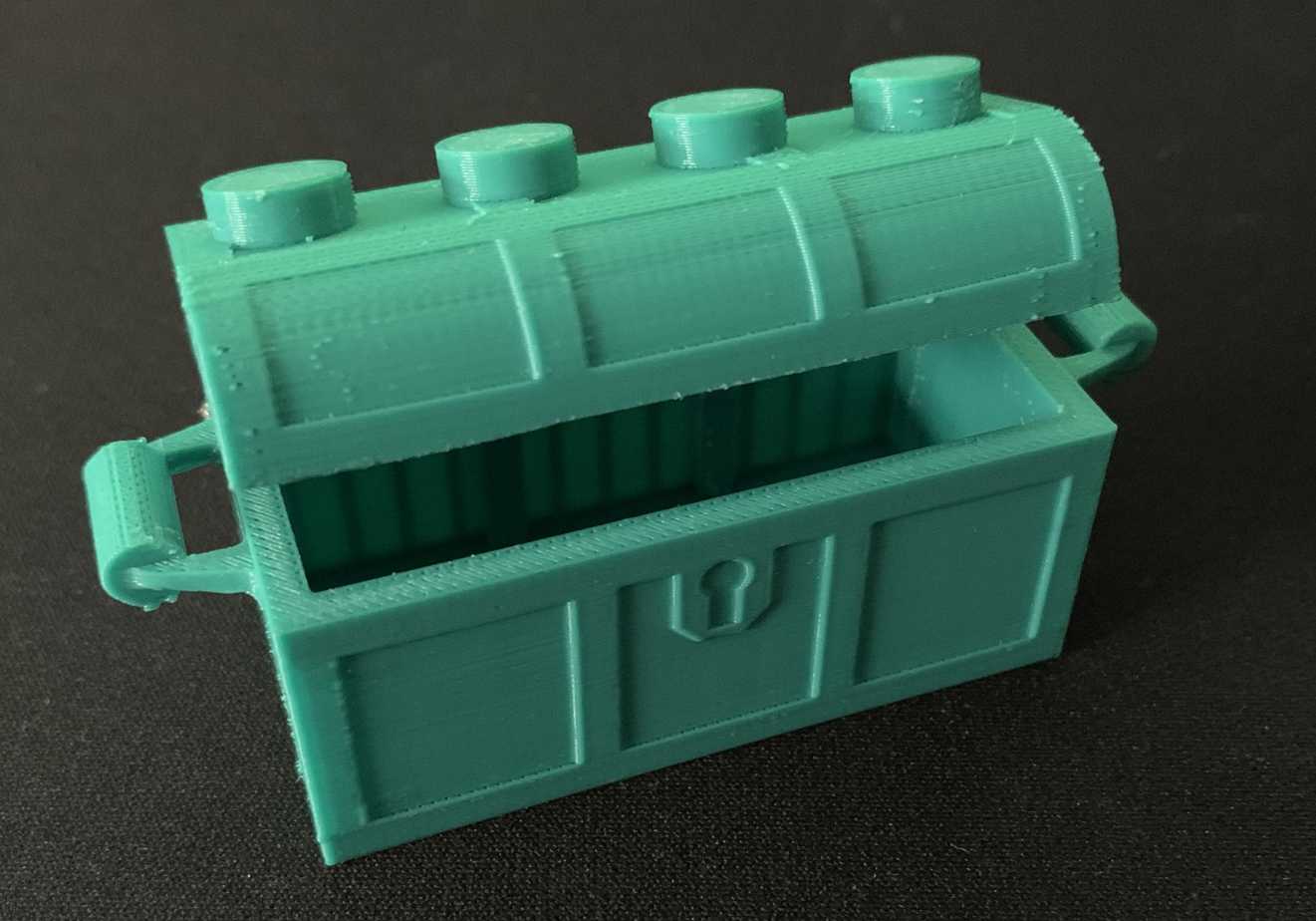 Mô hình rương kho báu LEGO được phóng to 1000% so với kích thước gốc. Sản phẩm được thiết kế tỉ mỉ với kỹ thuật xử lý các chi tiết cong, đi kèm hướng dẫn về cách đặt support và lắp ráp bản lề bằng thanh kim loại cho người dùng in 3D.