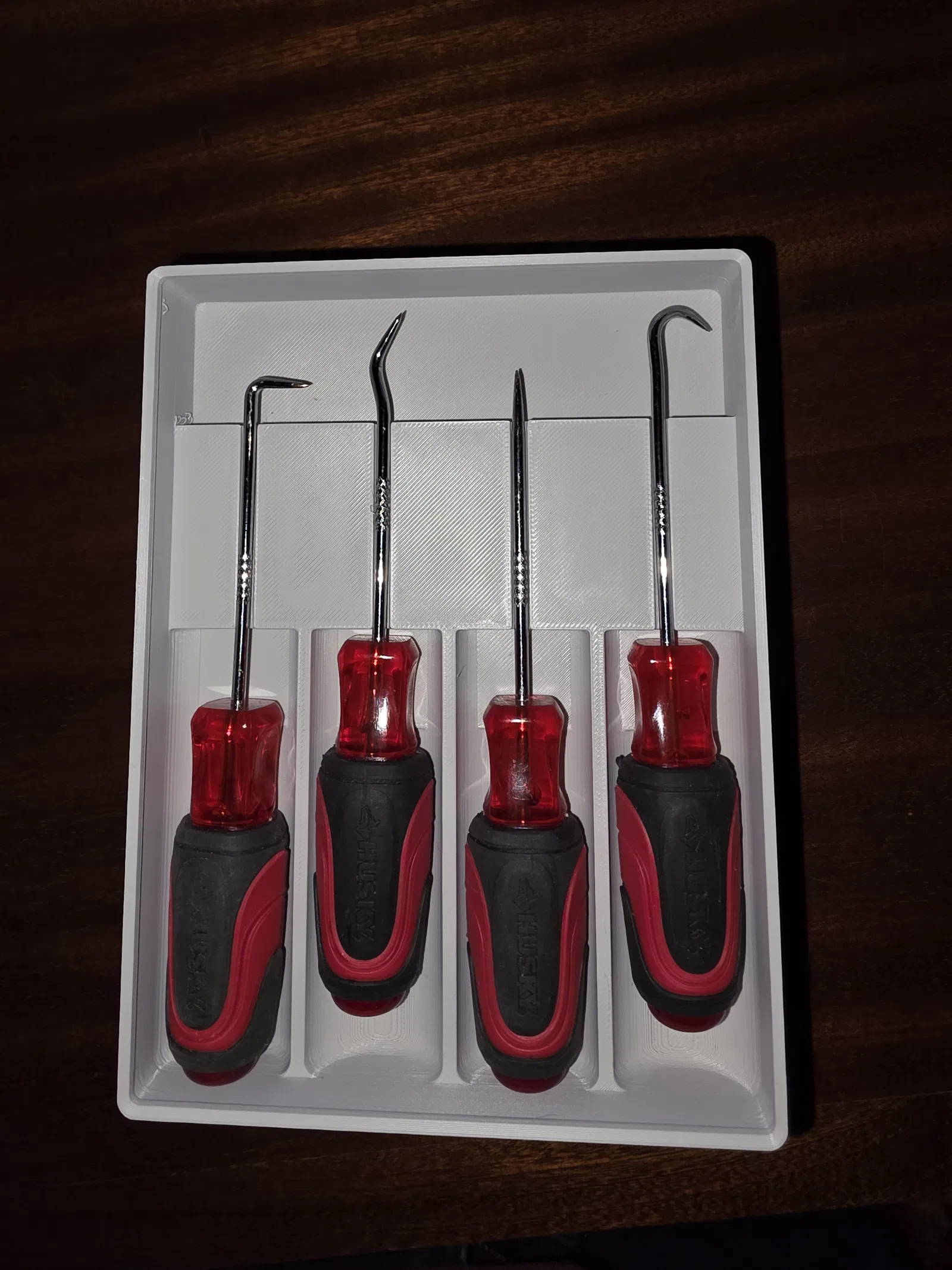 Nếu bác nào đang sở hữu bộ dụng cụ Husky Mini Pick đời cũ mà thấy chúng cứ nằm lăn lóc trên bàn làm việc hay trong ngăn kéo thì đây chính là giải pháp dành cho các bác. Em xin giới thiệu mẫu khay được thiết kế riêng biệt theo tiêu chuẩn Gridfinity, giúp cố định gọn gàng 4 món dụng cụ của Husky một cách khoa học nhất. Với thiết kế tối ưu, mỗi cây pick sẽ nằm đúng vị trí của nó, giúp bác dễ dàng tìm kiếm ngay khi cần mà không phải bới tung cả hộp đồ nghề lên.