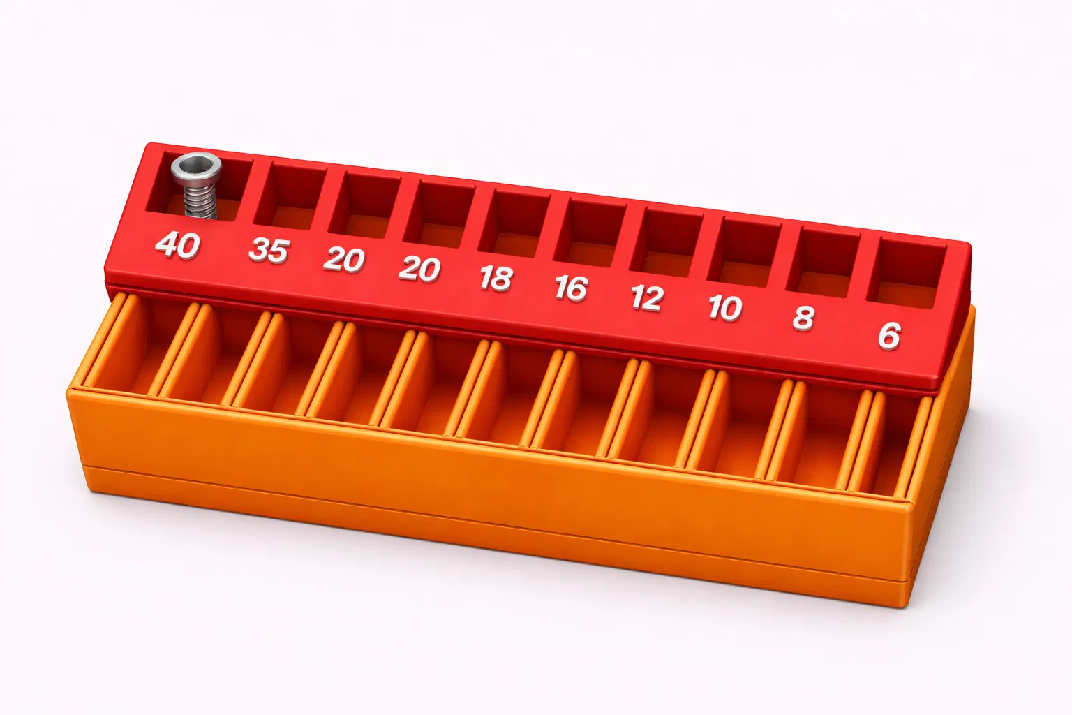 Đây là mẫu khay phân loại ốc vít được chia làm hai phần để thuận tiện cho việc in 3D và tháo lắp. Bạn chỉ cần thả ốc vít từ phía trên, ốc sẽ tự động rơi vào các lỗ có kích thước phù hợp để phân loại nhanh chóng và chính xác.