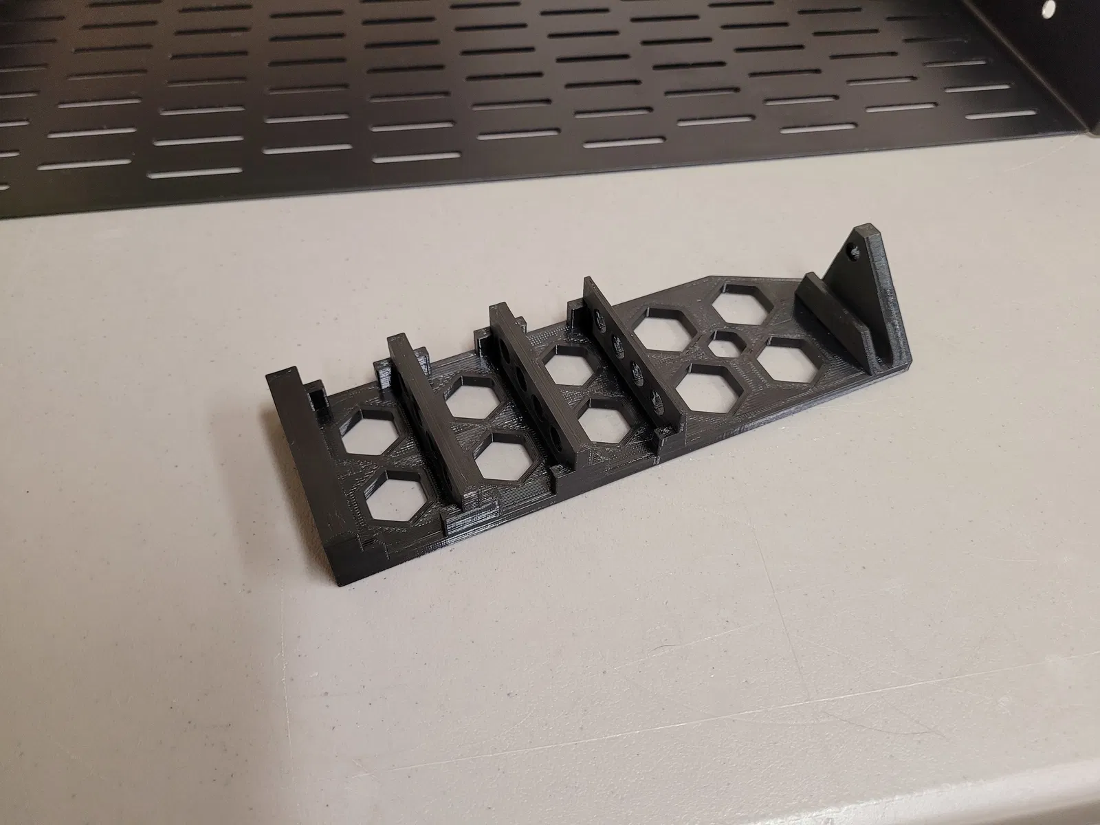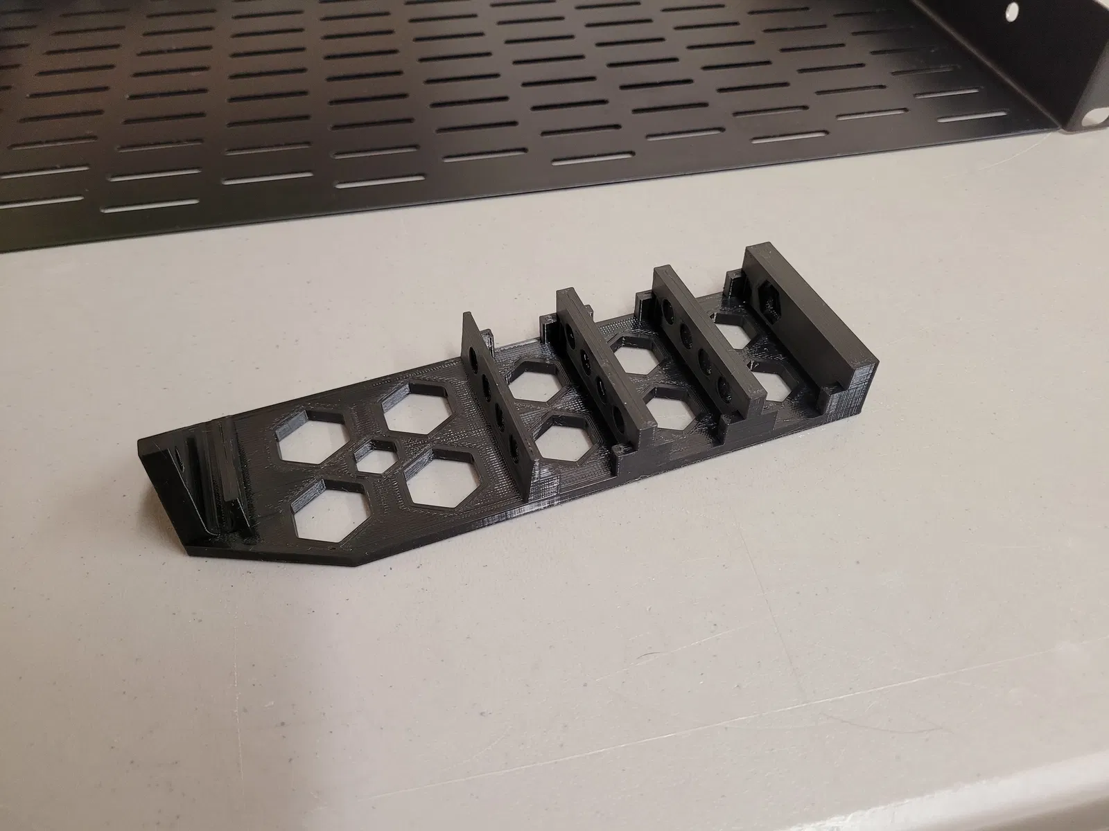 Đây là một chi tiết khá chuyên dụng nhưng biết đâu lại hữu ích cho bác nào cần. Mình làm cái này để dùng với kệ 1U mà mình đang có. Mình muốn tạo một khoảng đệm nối giữa switch Cisco WS-C3560CX-12PD-S và mép kệ rack. Thiết kế này có 3 vị trí để gắn jack nối RJ45 kích thước 24x48mm mà mình có sẵn. Một bên có lỗ vít để gắn vào tai rack của switch Cisco. Bên còn lại có lỗ âm để đặt đai ốc ¼-20. Sau đó, bác chỉ cần khoan một lỗ đúng vị trí rồi dùng bu lông ¼-20 dài ½ inch cùng vòng đệm để cố định nó xuống là xong.