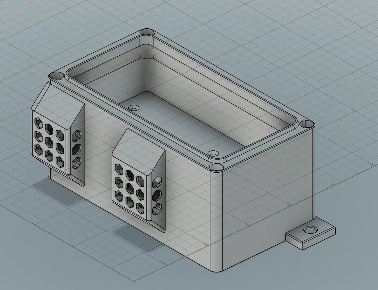 Tôi đã chỉnh sửa lại bản thiết kế này để thêm phần nắp che khí xả giúp tản bớt luồng khí, thay vì thổi trực tiếp qua máy in. Tôi cũng đã loại bỏ lỗ cắm nhiệt (heat insert) và thiết kế lại để bắt vít trực tiếp vào đế, đồng thời bổ sung các lỗ lắp đặt tương thích cho máy Voron Trident.