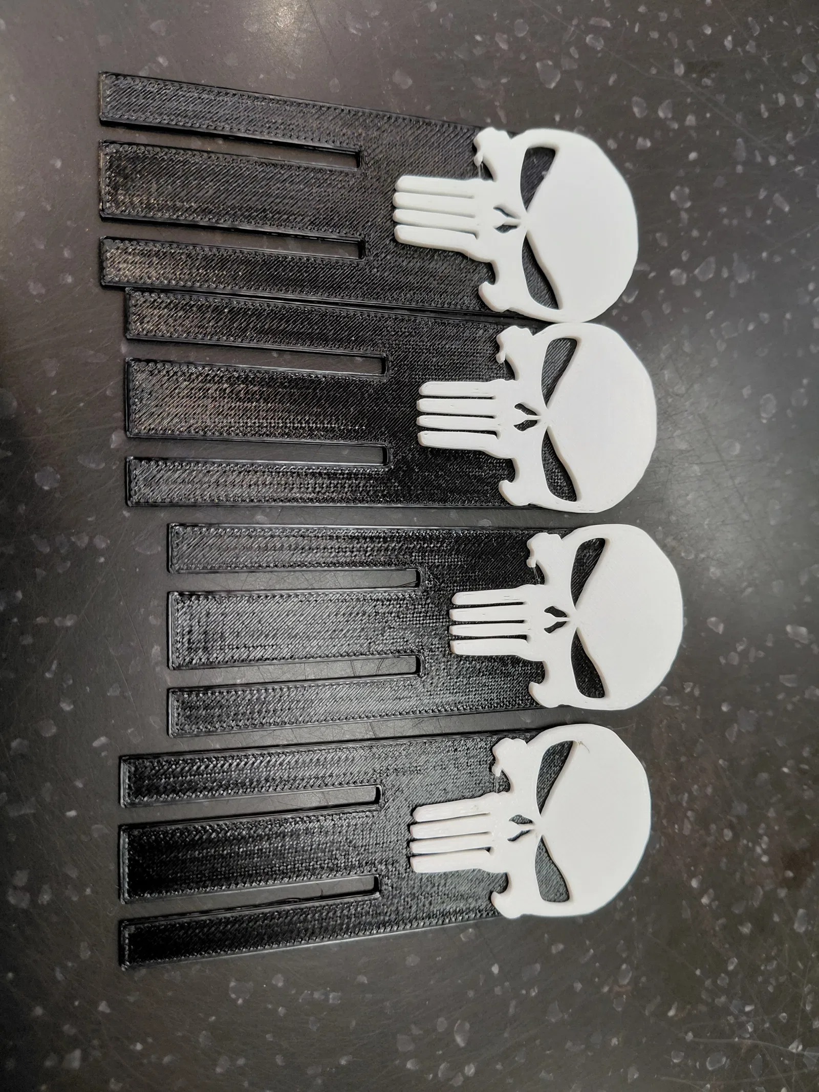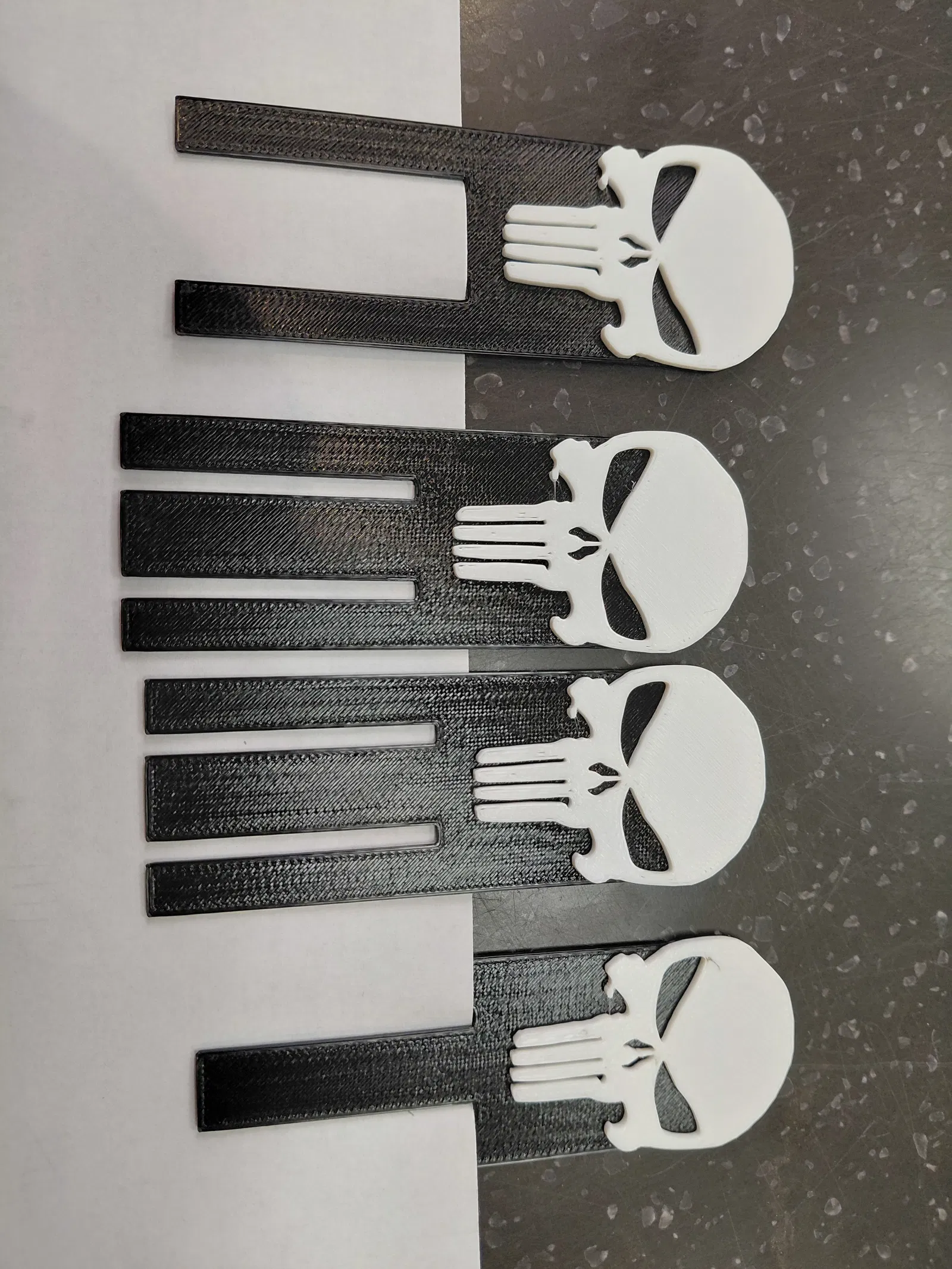 Sau khi in một bộ bookmark Avengers miễn phí cho sự kiện của xe thư viện lưu động tại địa phương, mình được yêu cầu in thêm vài cái bookmark Punisher. Tiếc là mình không tìm thấy mẫu nào có sẵn cả! Hy vọng mọi người không phiền, mình đã sử dụng khuôn stencil để tạo ra một chiếc bookmark có kiểu dáng khá tương đồng với những mẫu trước đó. Cảm ơn vì đã chia sẻ file này! - BLR từ Đội Maker Lab của Thư viện công cộng Virginia Dillard-Smith