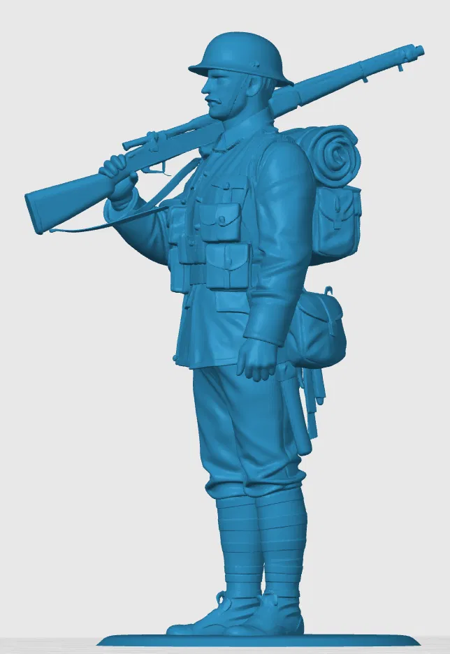 Nếu bạn là người đam mê lịch sử quân sự hoặc đang sưu tầm các mô hình lính chì (toy soldier) cổ điển, thì mẫu thiết kế người lính bộ binh Anh thời kỳ Thế chiến thứ nhất này chắc chắn sẽ làm bạn thích thú. Mô hình được lấy cảm hứng từ hình ảnh các binh sĩ thực tế giai đoạn đầu thế kỷ 20, với đầy đủ trang bị từ mũ sắt đặc trưng, ba lô, cho đến khẩu súng trường vác trên vai. Từng chi tiết nhỏ trên bộ quân phục và trang bị cá nhân đã được tái hiện lại một cách tinh tế, mang lại cảm giác hoài cổ và sống động cho người xem.
