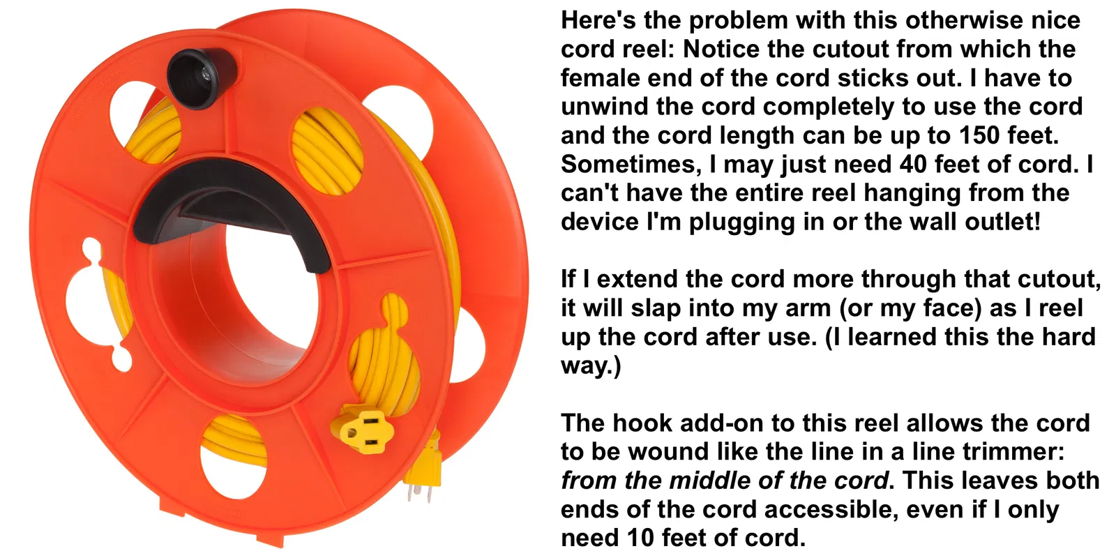 Rulo cuộn dây Bayco 150ft rất tiện nhưng lại có một nhược điểm lớn là phải tháo hết toàn bộ dây ra mới dùng được. Móc này giúp bạn giữ phần giữa của dây để lấy được cả hai đầu dây khi cần, giải quyết triệt để vấn đề này.