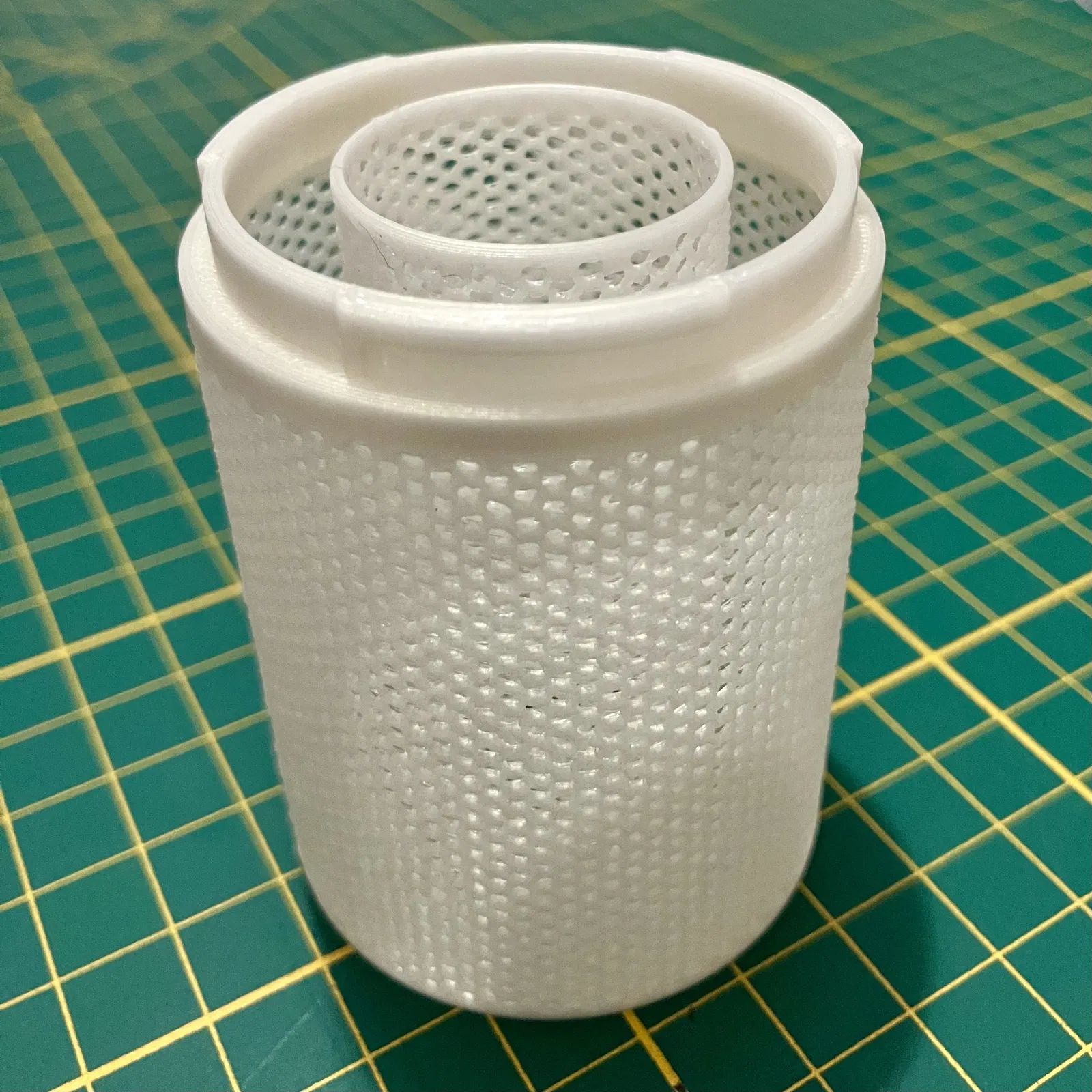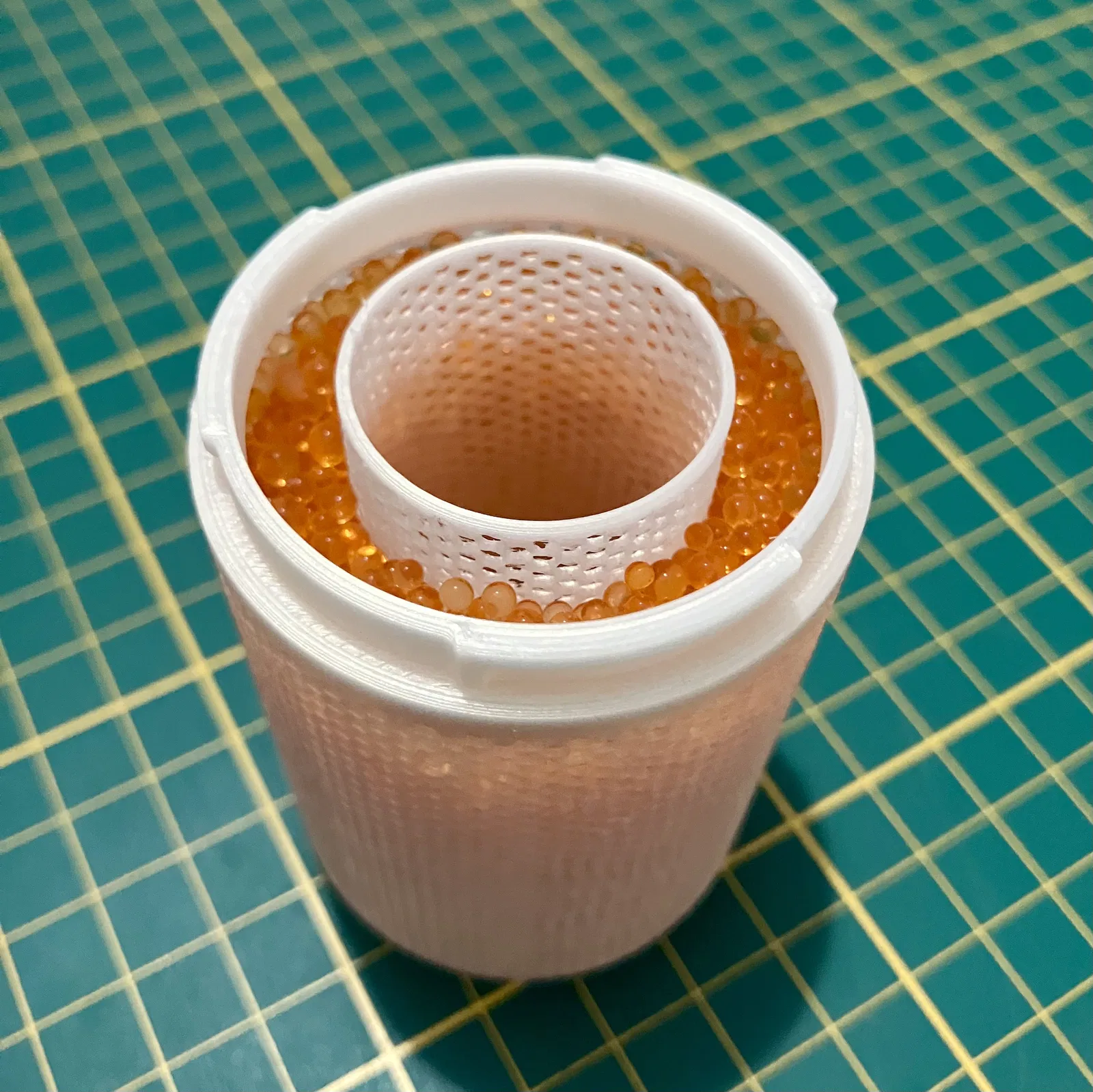 Sản phẩm được thiết kế với hai phần là xi lanh ngoài và xi lanh trong, tạo ra không gian chứa rộng rãi nhưng vẫn gọn gàng. Thiết kế này tận dụng tối đa khoảng trống ở giữa cuộn nhựa mà bạn thường bỏ phí. Việc sử dụng rất đơn giản, bạn chỉ cần in phần thân, đổ hạt Silica gel vào giữa, sau đó lắp vào trục chính giữa của cuộn nhựa Prusa. Nhờ các lỗ lưới có đường kính 1mm, hạt hút ẩm sẽ không bị rơi ra ngoài mà vẫn đảm bảo hiệu quả lưu thông không khí tuyệt vời, giúp sợi nhựa của bạn luôn ở trạng thái tốt nhất.