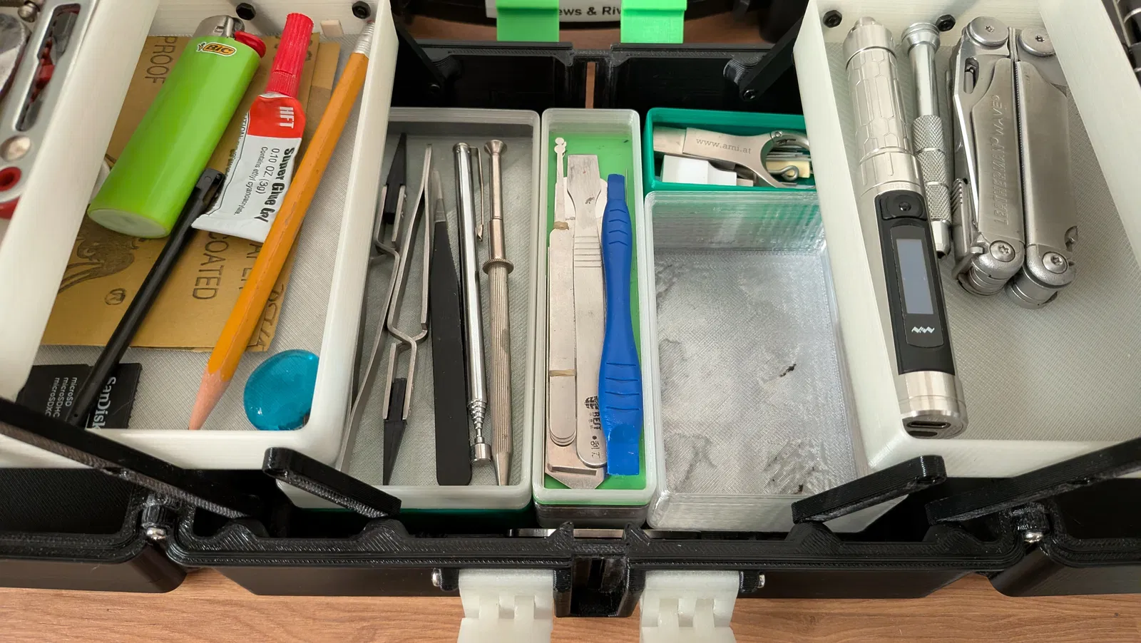 Phần đế lưới (grid base) được thiết kế không theo chuẩn thông thường để phù hợp với các cánh tay đòn (cantilever arms). Tấm đế này được tạo bằng công cụ Gridfinity Generator. Bạn có thể tự tạo các khay chứa của riêng mình tại đây: https://gridfinity.perplexinglabs.com/
