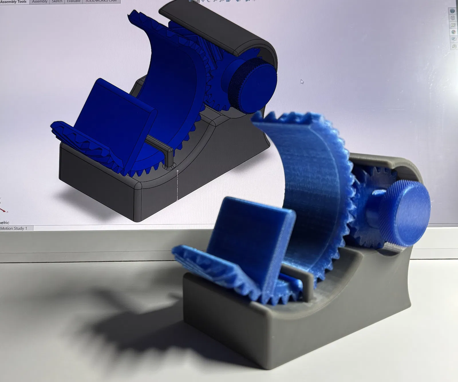 Giá đỡ điện thoại điều chỉnh linh hoạt với tỉ lệ bánh răng herringbone 2:1. Thiết kế cứng cáp, kèm file STL và sldprt, phù hợp cho nhiều loại điện thoại nhờ cơ chế ma sát ổn định.