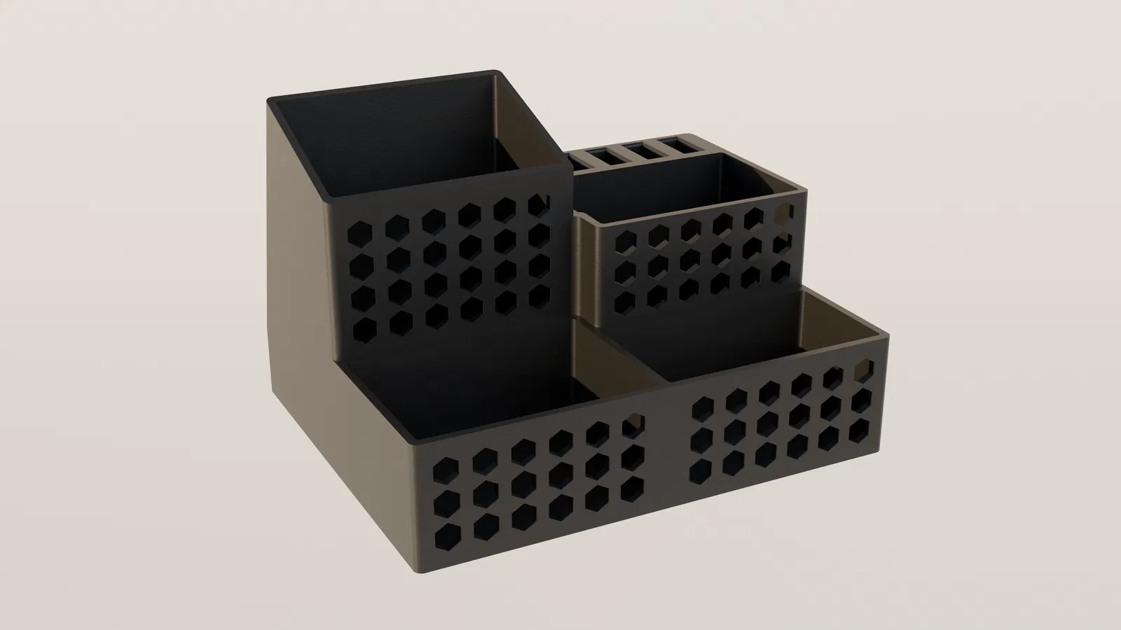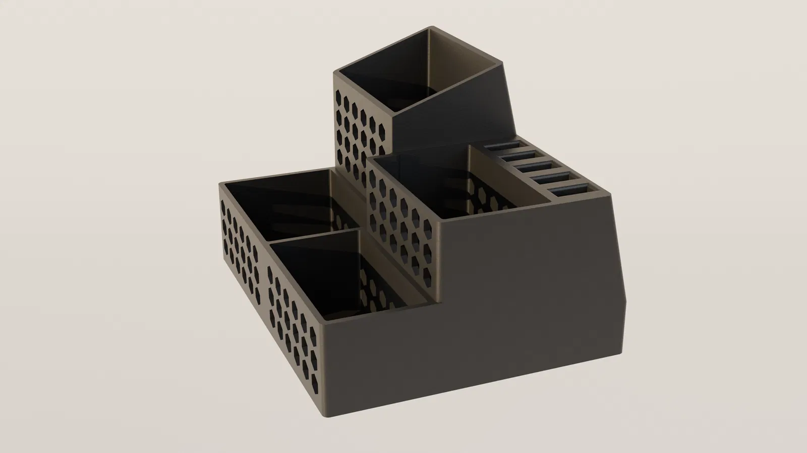 Bạn đang tìm kiếm một giải pháp để sắp xếp lại bàn làm việc vốn dĩ đang quá lộn xộn với các loại bút viết và thiết bị điện tử? Mẫu thiết kế khay đựng để bàn (Desk Organizer) kết hợp giá cắm 5 USB này chính là sự lựa chọn tối ưu nhất. Với kiểu dáng hiện đại, họa tiết tổ ong độc đáo và phân ngăn tiện lợi, sản phẩm giúp bạn dễ dàng quản lý dụng cụ học tập cũng như các thiết bị lưu trữ dữ liệu. Đây là mẫu in 3D rất hữu ích, dễ thực hiện và phù hợp với nhiều loại vật liệu như PLA hay PETG. Chỉ với vài giờ in ấn, bạn sẽ sở hữu ngay một phụ kiện bàn làm việc đẳng cấp, giúp không gian làm việc của bạn trở nên chuyên nghiệp, gọn gàng và khoa học hơn hẳn. Hãy bắt tay vào in ngay hôm nay để trải nghiệm sự tiện dụng mà nó mang lại.