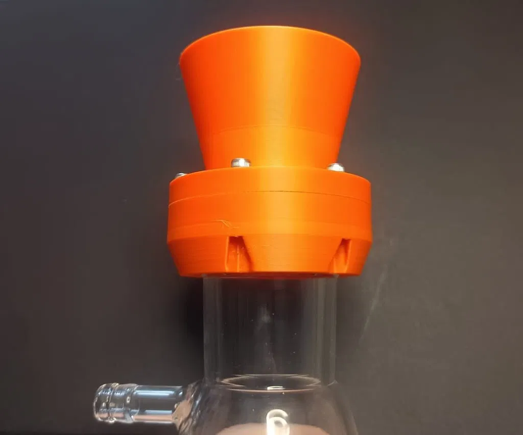 Thiết kế hệ thống lọc chân không cho phễu 50mm, tương thích bình lọc miệng 34mm. Cần 2 vòng đệm cao su và ốc M3 để lắp ráp. Lưu ý chọn vật liệu in phù hợp với dung môi và sử dụng tính năng 'detect thin walls' khi in.