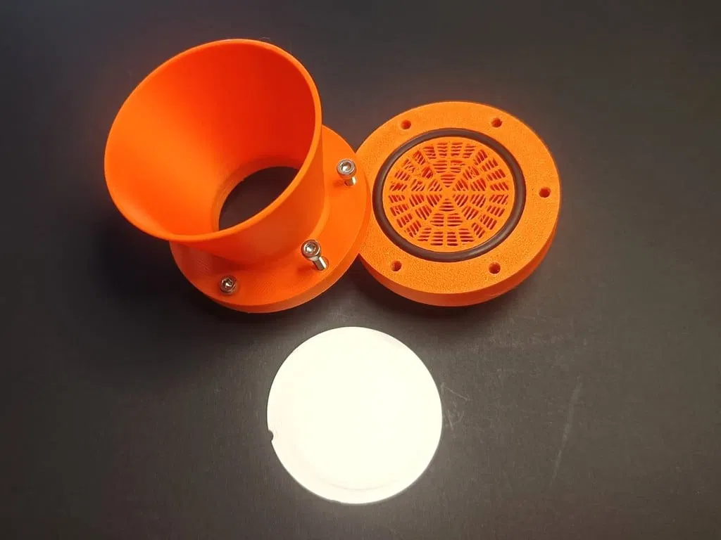 Đây là thiết kế hệ thống lọc chân không dùng để gắn các loại phễu lọc 50mm tiêu chuẩn lên bình lọc hút chân không. Thiết kế này tương thích với các bình có miệng 34mm (đường kính ngoài 43mm). Bạn cần sử dụng 2 vòng đệm cao su (o-ring) kích thước đường kính ngoài 43mm, đường kính trong 36mm và độ dày 3.5mm để đảm bảo giữ bộ lọc chắc chắn. Bạn có thể dùng thêm vòng thứ 3 (cùng kích thước) để làm kín với bình lọc, nhưng theo kinh nghiệm của mình thì không cần thiết vì hầu hết các loại máy bơm không khí không bị rò rỉ quá nhiều. Cần sử dụng 6 ốc M3 dài 20mm và 6 đai ốc để cố định bộ lọc. Phần đế có hai phiên bản: phiên bản tiêu chuẩn và phiên bản có phễu. Phễu giúp ngăn dung môi chảy ngược vào máy bơm nhưng cấu trúc này dễ gãy hơn và khó vệ sinh hơn. Bản in này có các chi tiết vách đơn (single wall), vì vậy hãy đảm bảo bạn sử dụng bộ tạo vách Arachne, bật tùy chọn "detect thin walls" hoặc các tùy chọn tương đương trên phần mềm cắt lớp (slicer) của bạn. Hãy kiểm tra kỹ xem dung môi bạn đang lọc có tương thích với loại vật liệu in hay không.