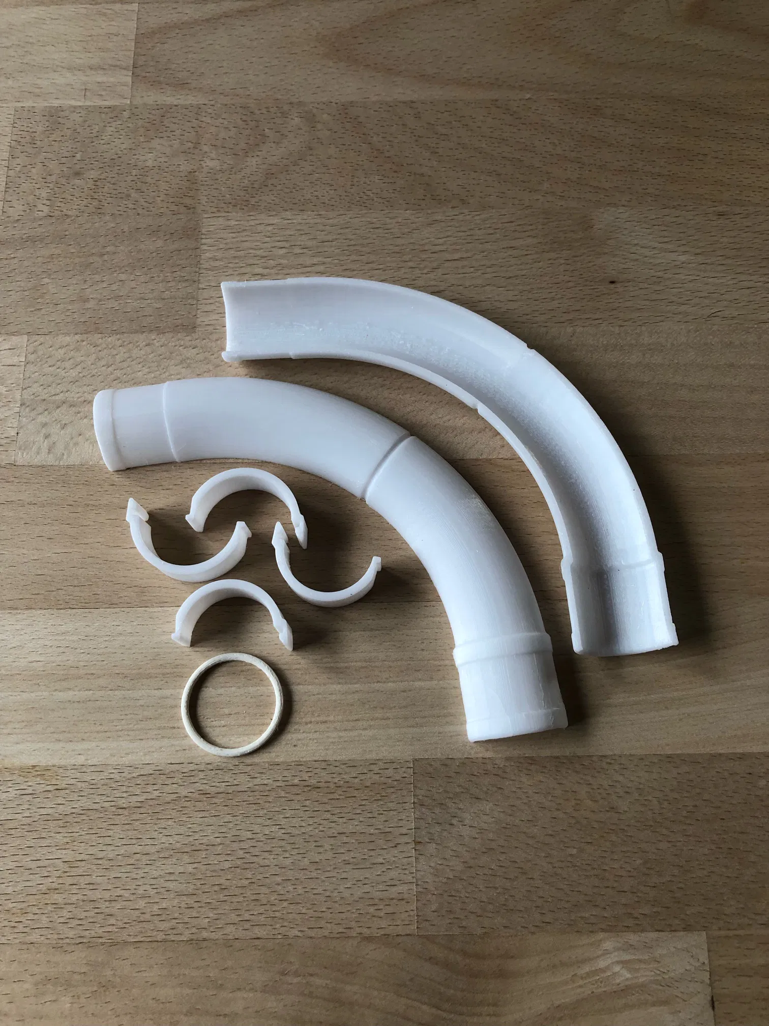 Phụ kiện chống gập này giúp các ống dẫn 16/22 uốn cong 90° mà không bị tắc nghẽn. Thiết kế bán nguyệt dễ lắp đặt, hỗ trợ in bằng nhựa TPU 95A hoặc dùng O-ring 23/2 mua ngoài.