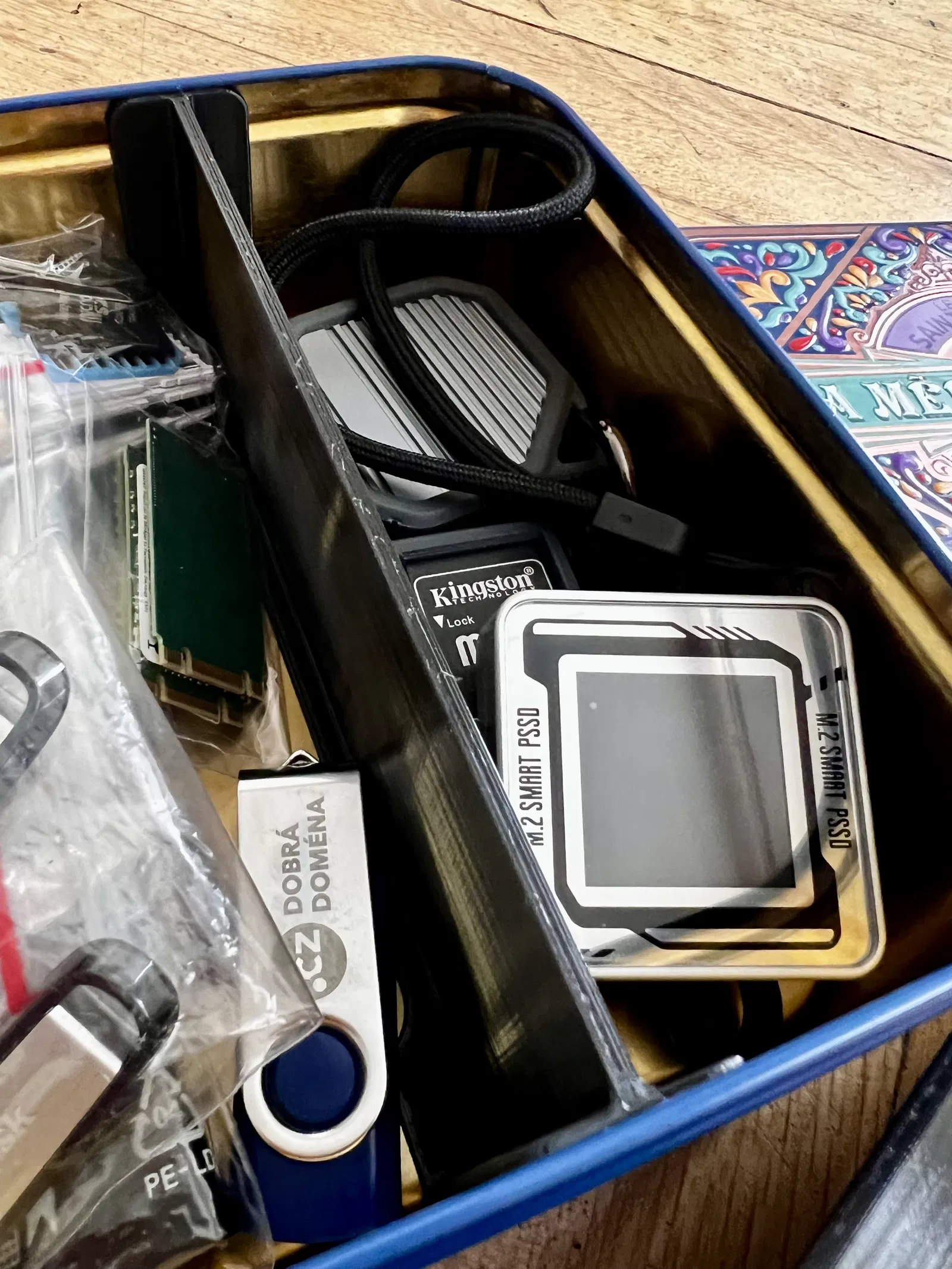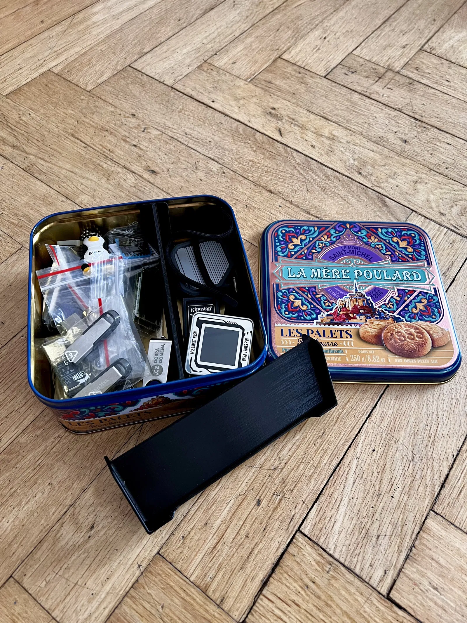 Sản phẩm này rất phù hợp để đựng các loại USB, thẻ nhớ, cáp sạc ngắn, hoặc các linh kiện máy tính nhỏ như ổ cứng M.2 SSD mà bạn thấy trong hình. Độ bền của nhựa in 3D đảm bảo thanh chia ngăn giữ vững vị trí, tạo nên những phân vùng cố định bên trong hộp thiếc vốn dĩ ban đầu chỉ là một không gian trống trơn.