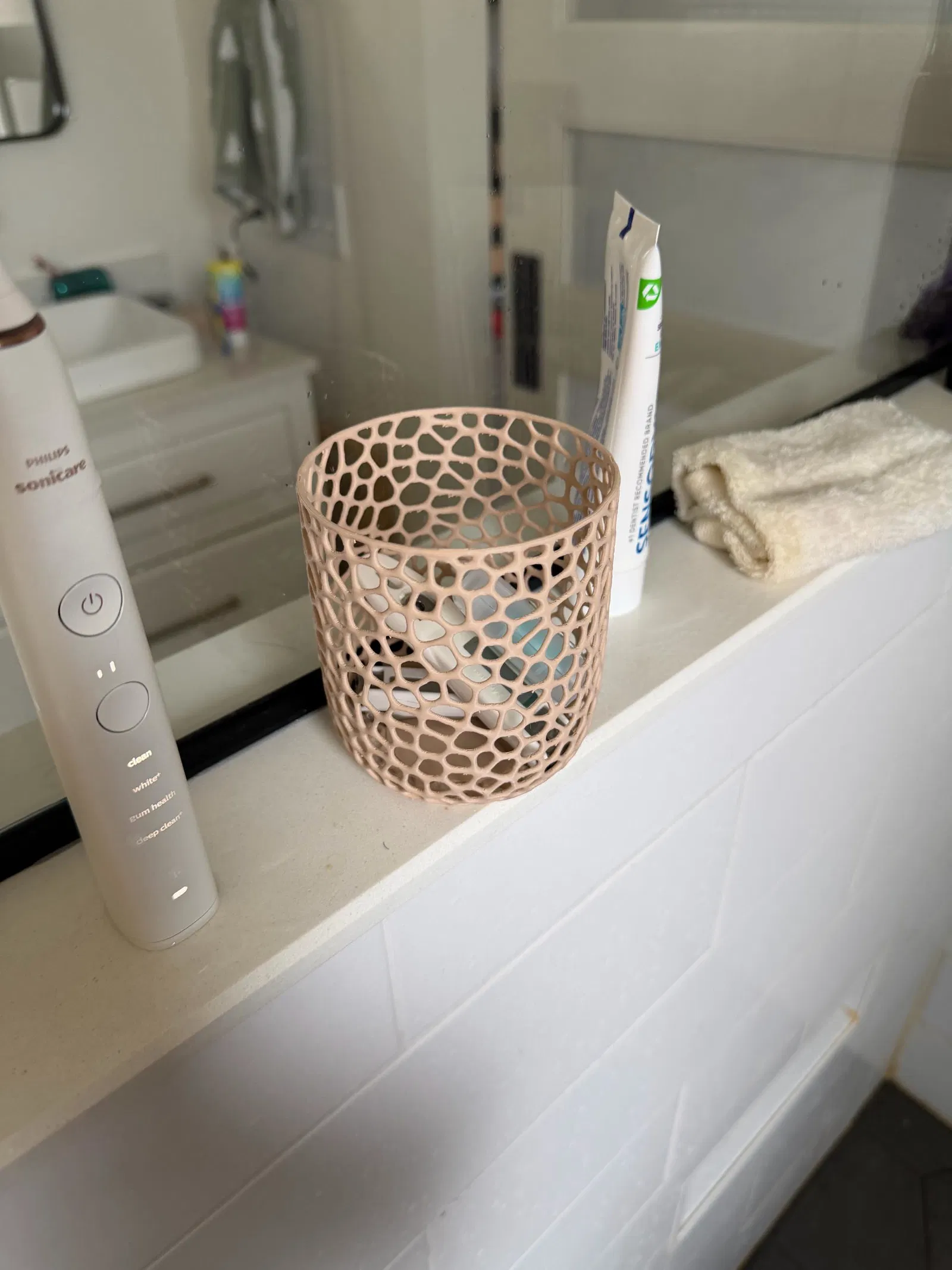 Sự linh hoạt là ưu điểm lớn nhất của mẫu thiết kế này. Bạn có thể sử dụng Meshy Cup để cắm bút, thước kẻ trên bàn làm việc, đựng bàn chải đánh răng trong phòng tắm, hoặc thậm chí là chứa các dụng cụ nhỏ trong nhà bếp. Cấu trúc dạng lưới thông thoáng giúp các vật dụng bên trong luôn khô ráo, sạch sẽ, không bị đọng nước hay ẩm mốc, rất phù hợp với môi trường phòng tắm vốn dĩ ẩm ướt.