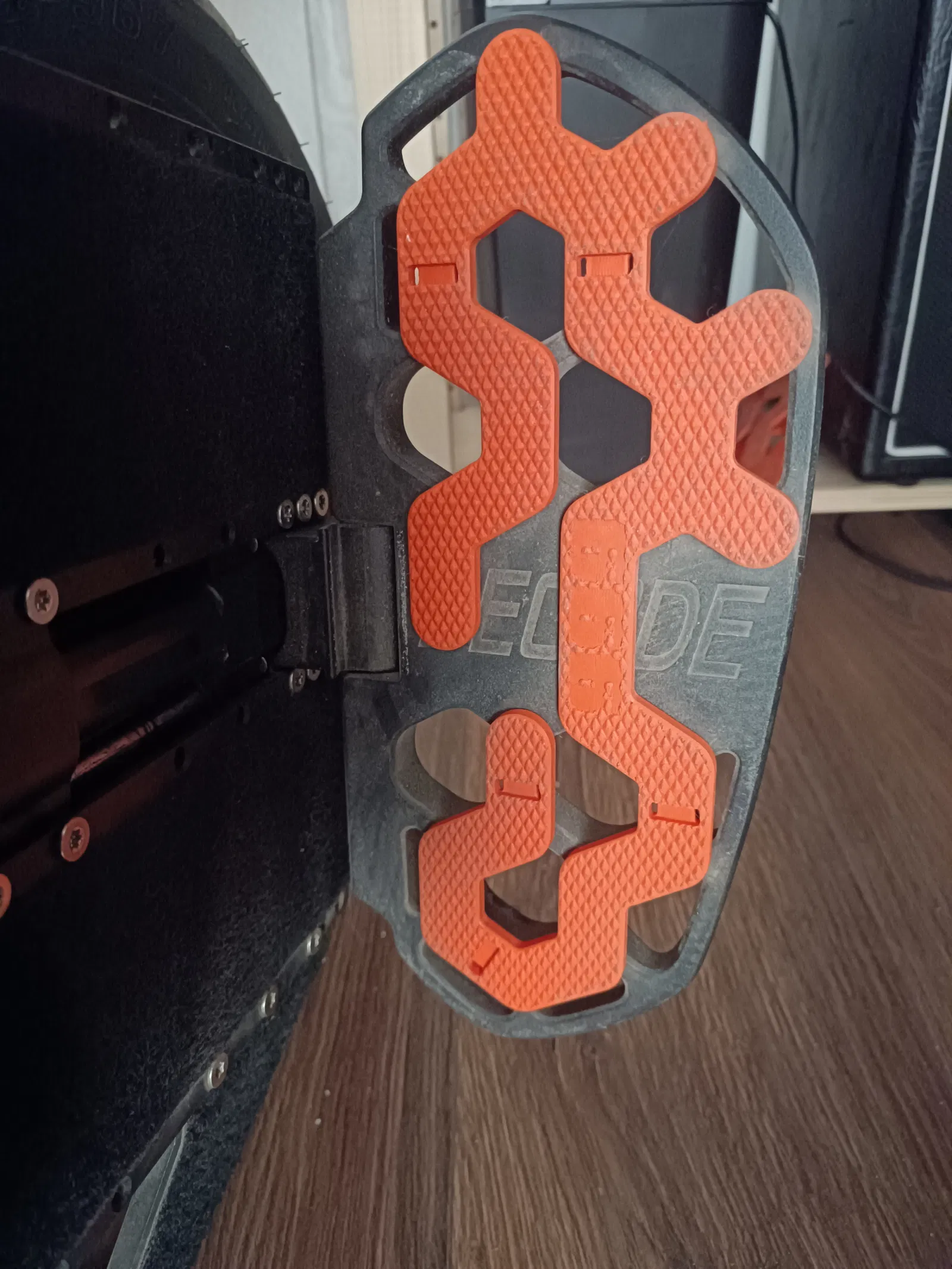 Là một người mới tập chơi, mình bị ngã khỏi xe khá nhiều. Điều đó khó tránh khỏi, nên nếu không thể ngăn việc bị ngã, thì ít nhất mình cần phải ngã một cách an toàn. Các gai nguyên bản của xe hơi cao, đâm sâu vào đế giày gây khó chịu, đôi khi còn làm mình khó nhấc chân ra kịp thời. Về cơ bản, mình phải nhấc hẳn chân lên rồi mới đặt xuống đất được, thay vì có thể trượt chân sang bên một cách nhanh chóng và kiểm soát. Các miếng đệm chân (power pads) càng làm vấn đề này tồi tệ hơn vì nó hạn chế cử động theo chiều dọc.