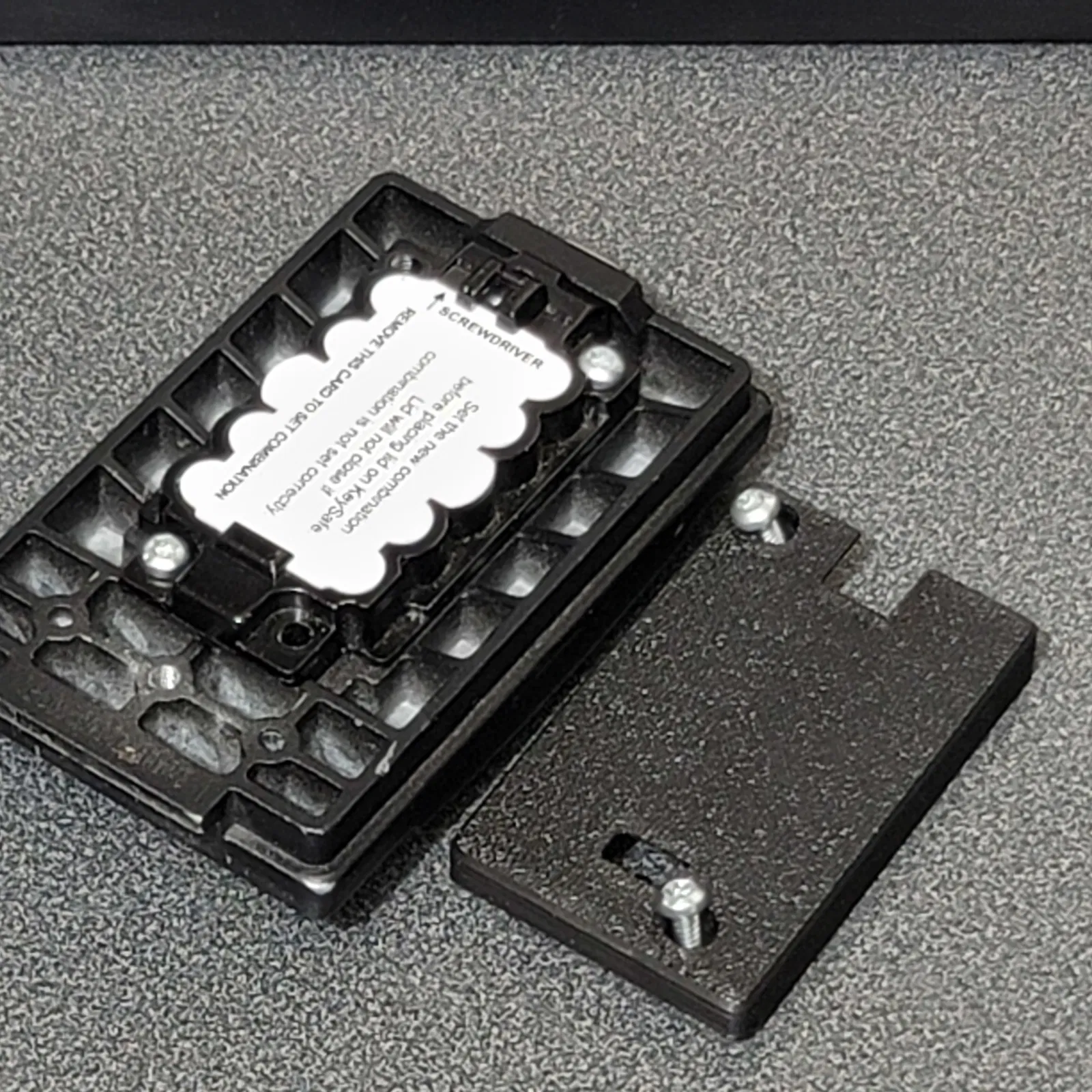 Phụ kiện này tận dụng hai con ốc có sẵn để bảo vệ mã số. Một điểm cộng nữa là nó tạo ra một khoảng trống phẳng lớn để dán nhãn, ví dụ như: "ĐỪNG ĐỂ MỞ", "Thiếu chìa khóa? Gọi cho tôi", hoặc "Để thẻ của bạn vào hộp cho đến khi trả lại chìa khóa".