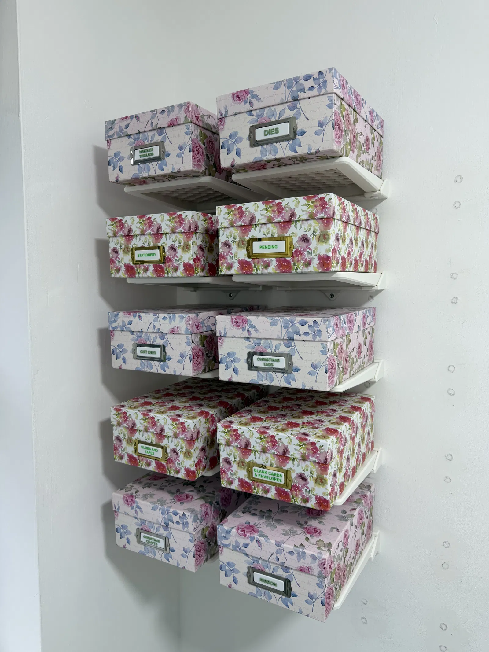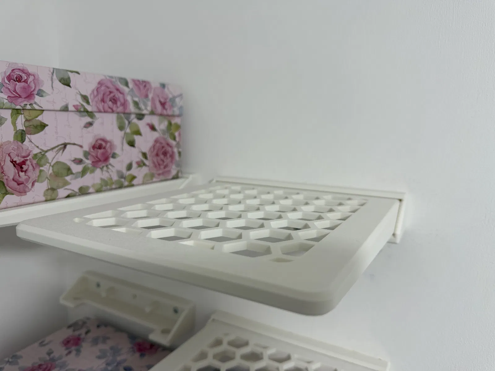 Mẫu kệ treo tường kích thước 240mm x 210mm, được thiết kế để chịu lực tốt và đủ rộng cho các loại hộp cỡ hộp giày. Sản phẩm có sẵn 2 phiên bản là kệ trơn và kệ họa tiết lục giác, dễ dàng lắp đặt cố định lên tường bằng ốc vít.