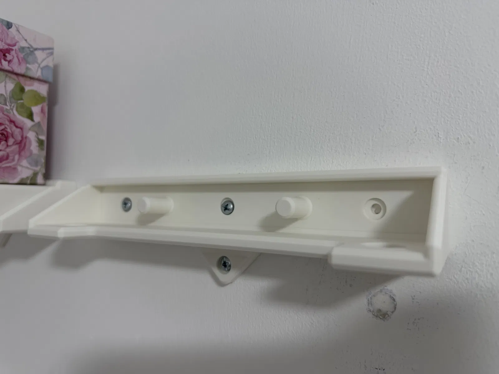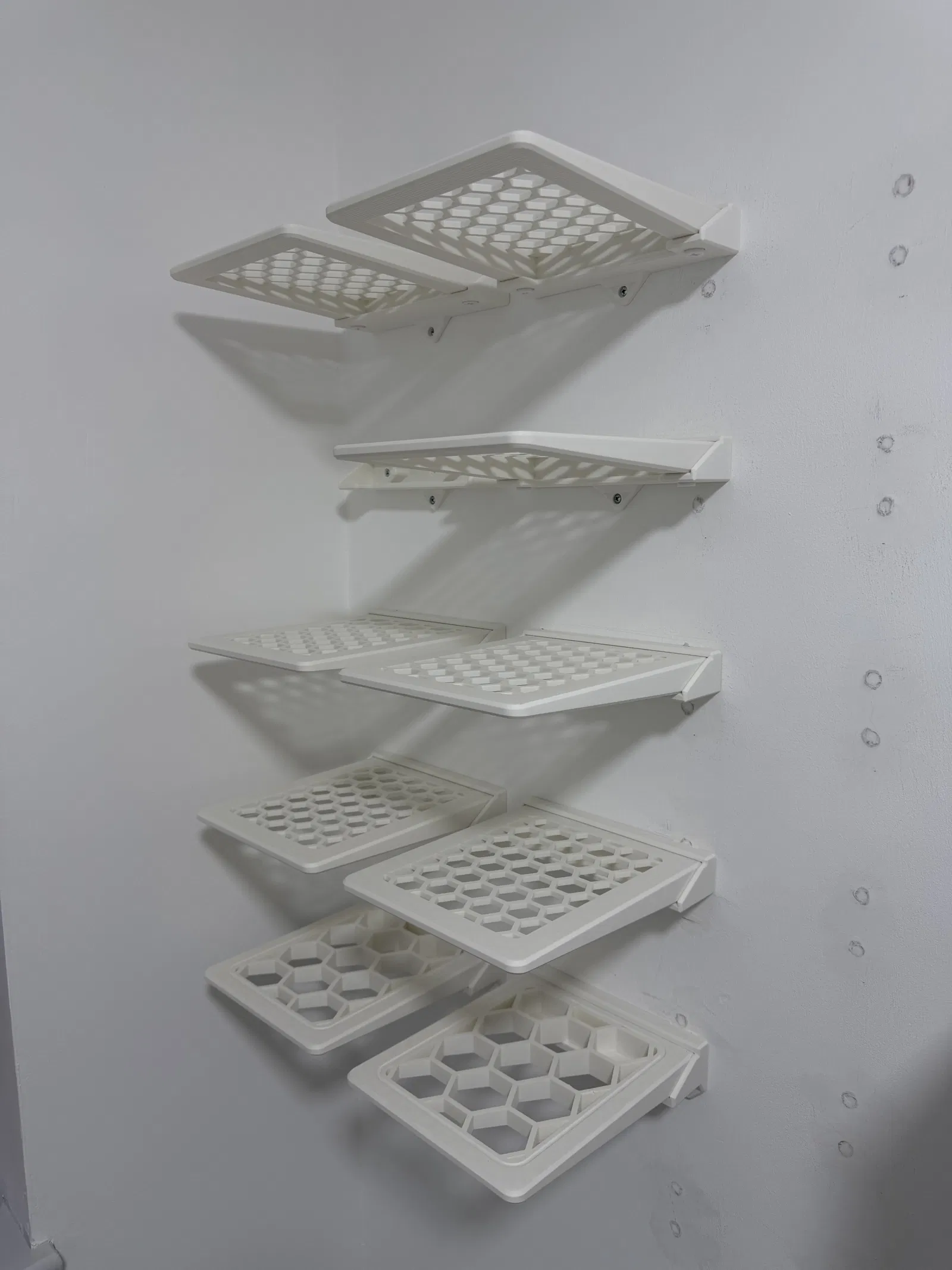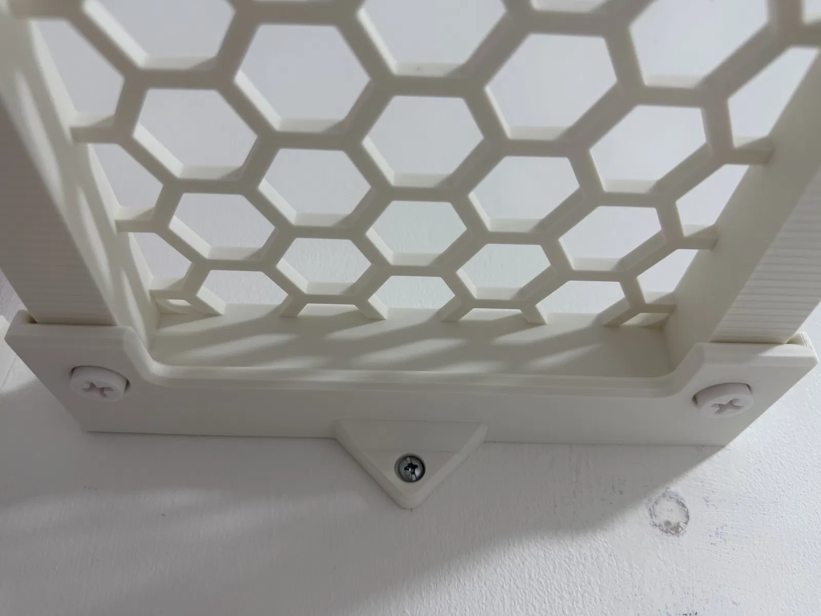 Mình có kèm theo 2 phiên bản: một loại kệ trơn và một loại có họa tiết lục giác (Hex). Phần giá đỡ gắn vào tường bằng 2 đến 4 ốc vít, riêng mình thì dùng 3 ốc là thấy ổn rồi.
