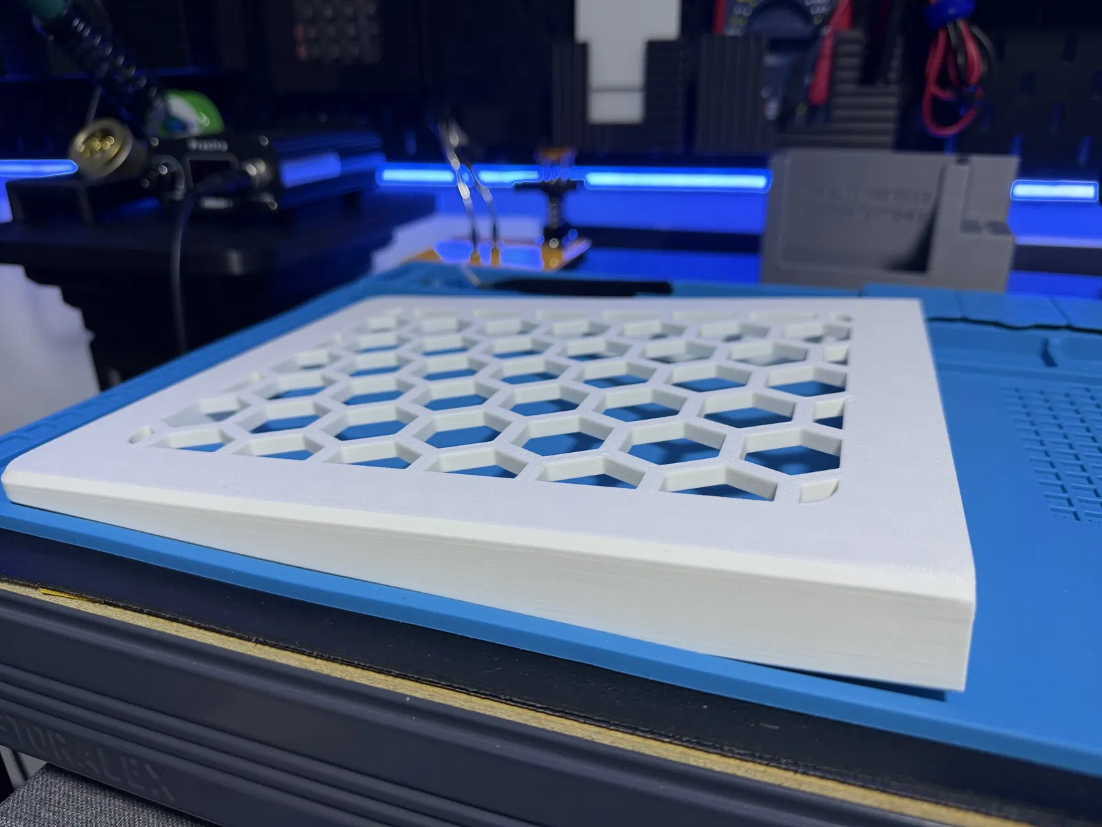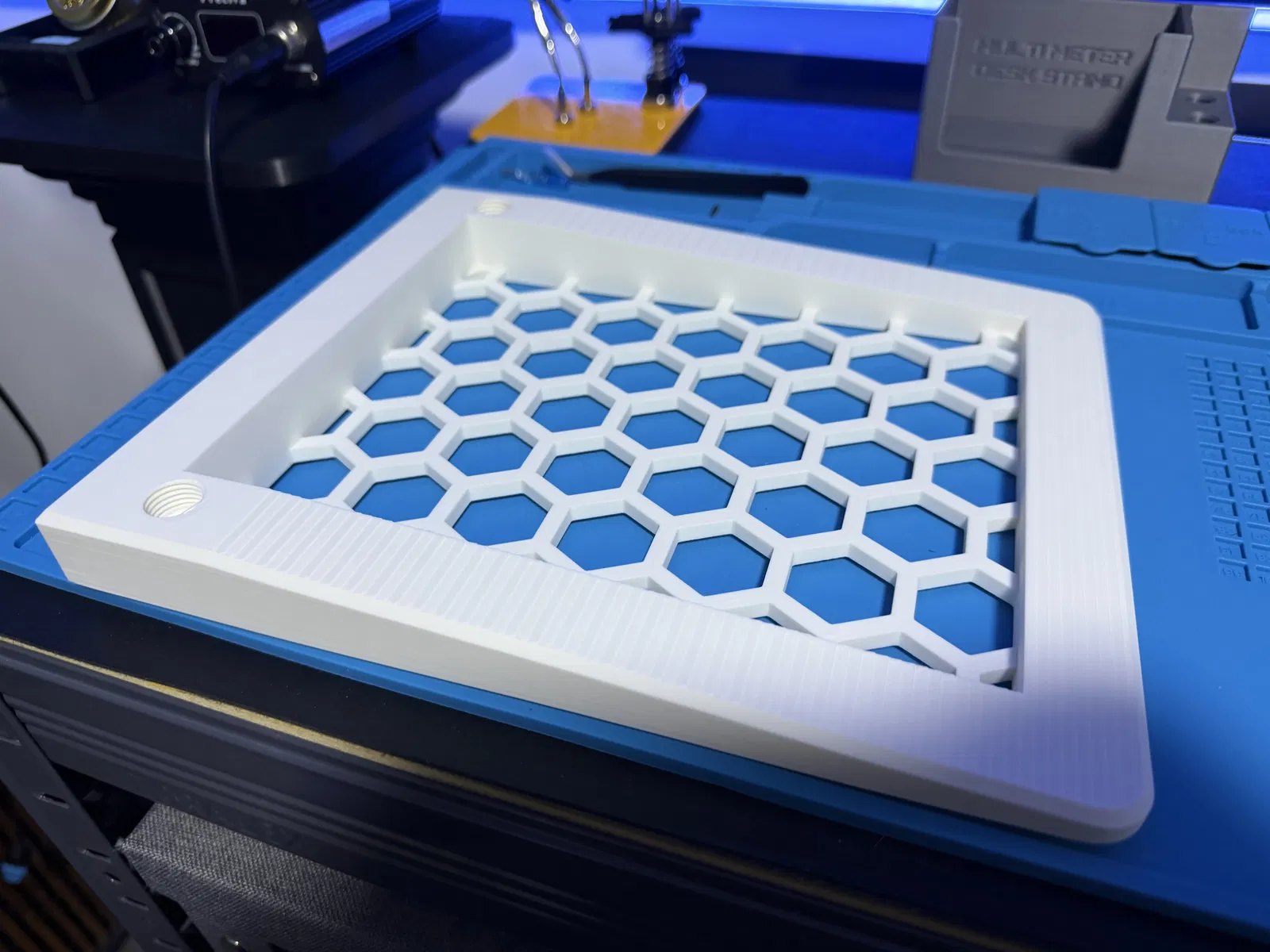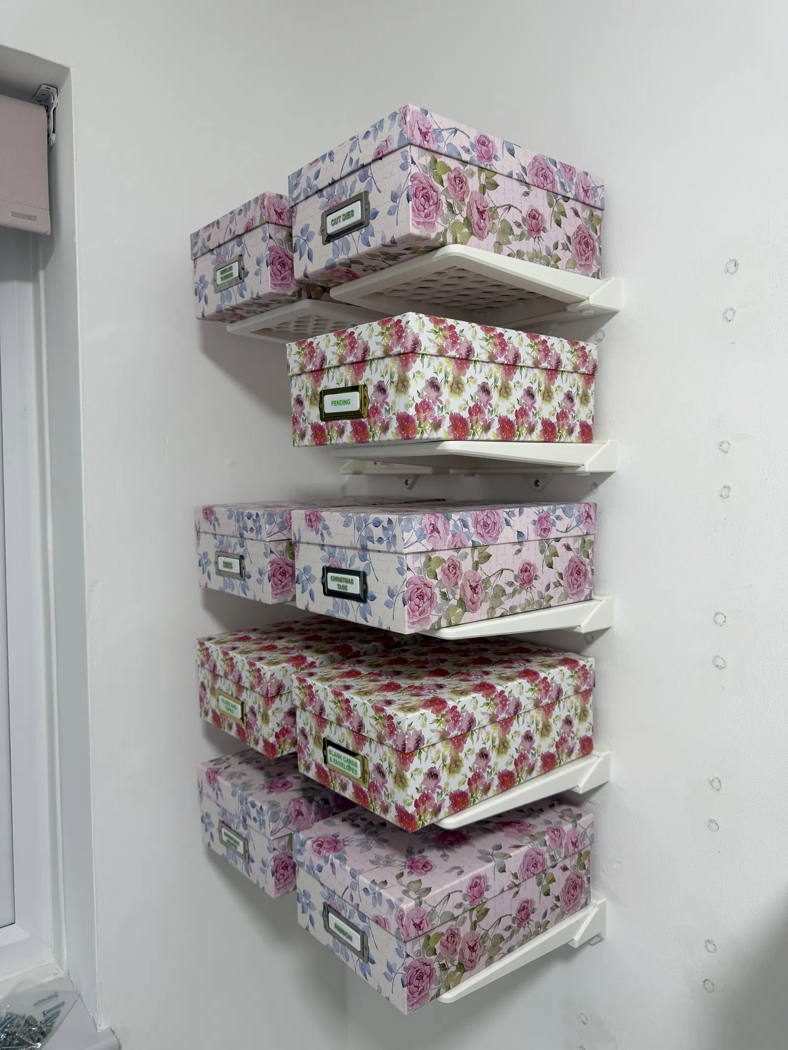 Mình có kèm theo 2 phiên bản: một loại kệ trơn và một loại có họa tiết lục giác (Hex). Phần giá đỡ gắn vào tường bằng 2 đến 4 ốc vít, riêng mình thì dùng 3 ốc là thấy ổn rồi.