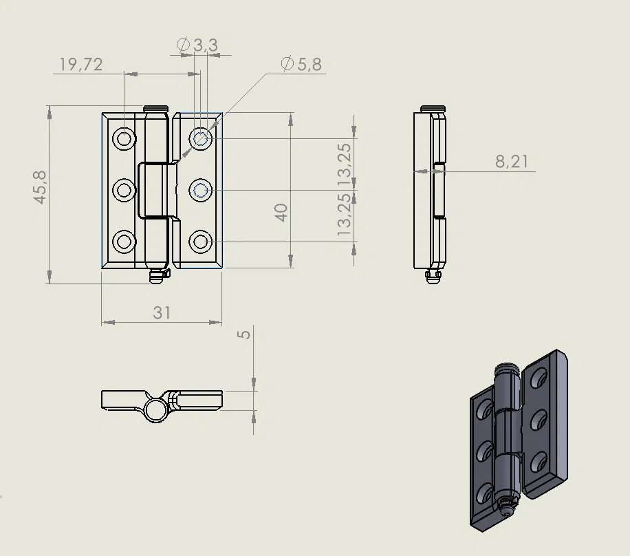 Điểm đặc biệt của thiết kế này nằm ở sự kết hợp giữa chốt bản lề có thể in được và cơ chế khóa chốt an toàn, giúp khớp nối vận hành mượt mà mà không lo bị tuột. Kích thước tổng thể 31x40mm cùng độ dày 5mm là thông số lý tưởng cho các món đồ gỗ nhỏ, tủ mini hoặc các mô hình vỏ hộp đựng linh kiện. Bạn có thể dễ dàng bắt vít vào bề mặt mong muốn thông qua 6 lỗ vít được thiết kế sẵn trên thân bản lề, đảm bảo độ ổn định cao nhất khi lắp đặt vào sản phẩm cuối cùng.