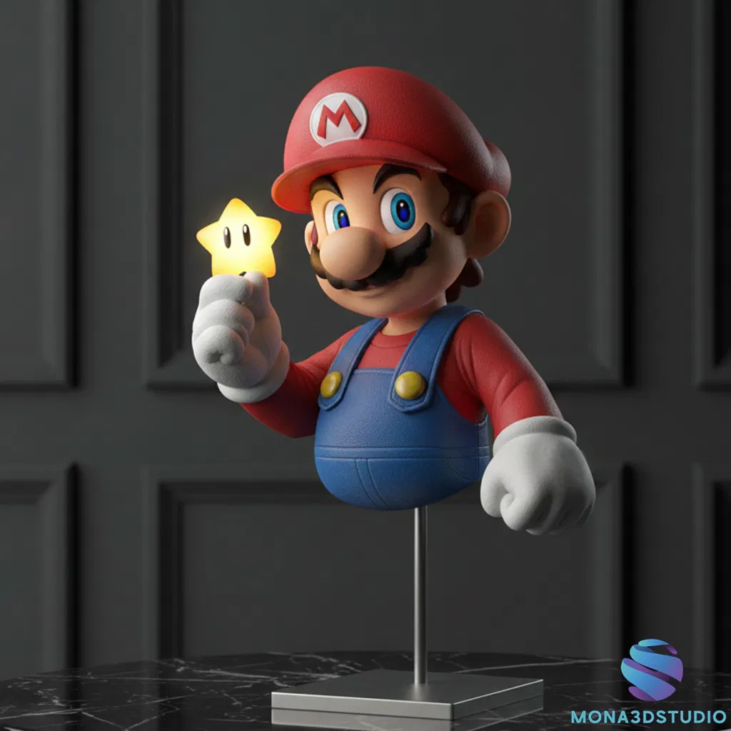 Mô hình 3D STL của tượng bán thân Super Mario trong tư thế kinh điển, đang cầm một ngôi sao Super Star (Starman). Sản phẩm cực kỳ phù hợp để in 3D (bằng máy FDM hoặc Resin) và là lựa chọn lý tưởng cho các fan hâm mộ trò chơi điện tử Nintendo cũng như loạt game Super Mario.