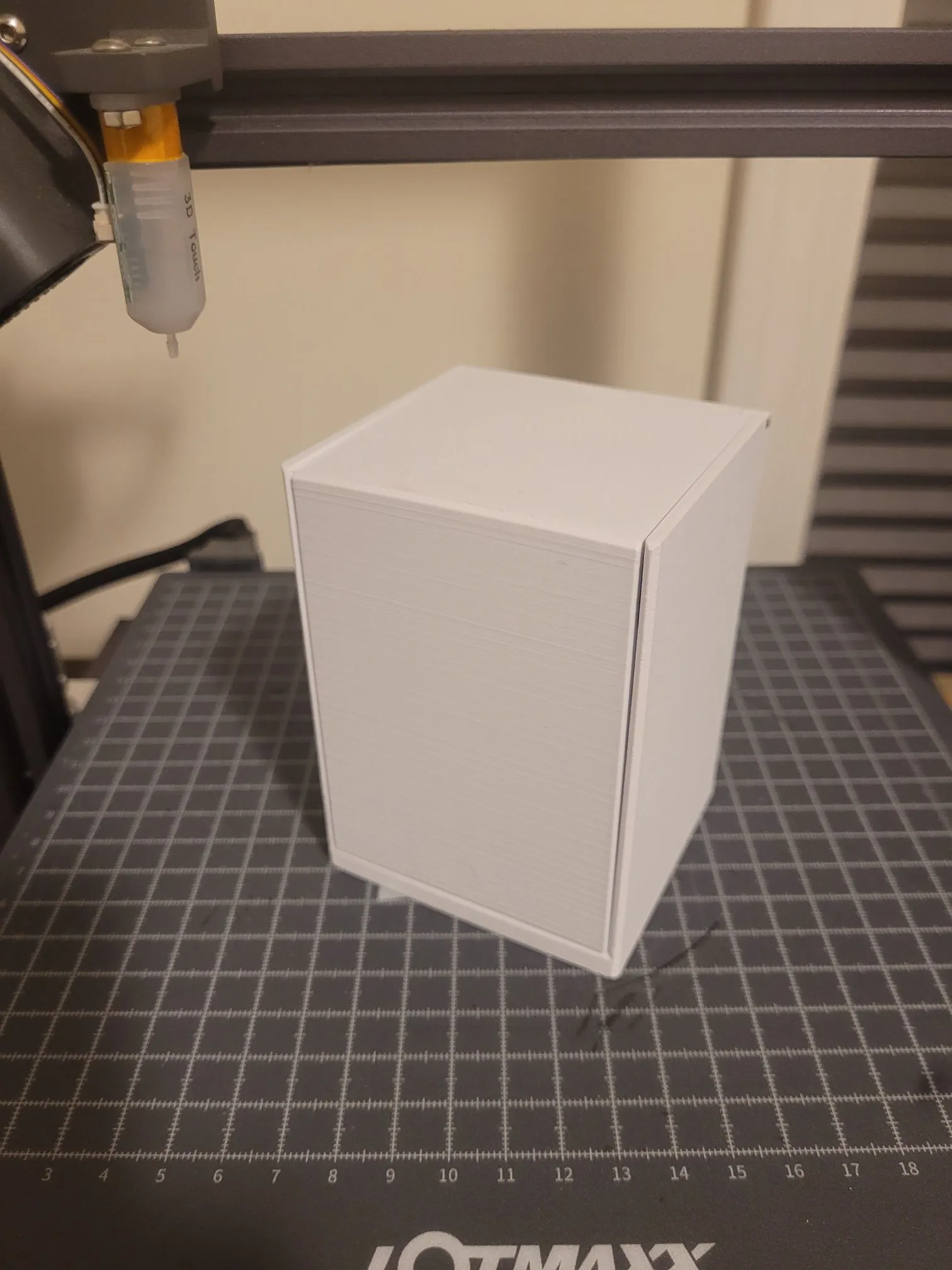 v0.1 ~2017: In lần in thành công đầu tiên, nhưng cần phải chà nhám nhiều công việc sau khi in để vừa với thẻ. Bản lề trên cái này là giấy/băng dính, không có cơ chế khóa và giữ được 60 thẻ đã được bọc đơn. v0.2 ~2017: Tôi đã chọn thiết kế ultra pro hơn, thêm một khu vực cho xúc xắc phía sau các thẻ, một ý tưởng cho hệ thống chốt đã được tạo ra và toàn bộ hộp đã tăng hơn gấp ba lần kích thước. Thiết kế bản lề sử dụng vít m4 làm "chốt". Tôi đã không dành đủ thời gian trước khi in thiết kế này và nó không hoạt động và vẫn cần nhiều công việc làm sạch và chà nhám bên trong nhưng giữ được 75 thẻ. v0.3 ~2018: Kết hợp ý tưởng từ v2 với v1, tôi đã lấy chốt từ v2 và đặt nó lên v1 với một bản lề kẹp giấy đơn giản. v0.4 ~2018: Làm cho các bức tường dày hơn/mạnh hơn một chút và đơn giản hóa bản lề để loại bỏ vòng lặp kỳ lạ trong kẹp giấy, chọn cách cắt theo chiều dài hoặc uốn các đầu xuống. v1.0 2/18/2018: Phát hành công khai đầu tiên, cũng là phiên bản đầu tiên >100 thẻ. Vẫn có thể tìm thấy ở đây: https://www.thingiverse.com/thing:2793367 v2.0 4/17/2018: Cập nhật cho v1 gọi là "Beefy" Box vào thời điểm đó, trên cùng một liên kết Thingiverse như trên. Đã làm cho các bức tường của hộp dày quá mức để che giấu các khuyết điểm trong các bản in và phù hợp với thay đổi khác: chuyển từ một chốt ở đáy sang một cái ở mỗi bên để ngăn hộp mở ra nếu bị lật ngược. v3.0 5/07/2019: https://www.thingiverse.com/thing:3677555 Gọi là "Ultimate" vào thời điểm đó. Thực sự là rất nhiều hộp v2 với các loại và kích thước mới. Hộp v3 mới chỉ có một vài loại và dễ in/lắp ráp hơn một chút. Vào thời điểm này, tôi đã mất hứng thú với TCG và máy in đầu tiên của tôi đã hỏng nên nhiều thứ chưa được kiểm tra và có nhiều điều khiến một số hộp không thể in được. v3.1 8/01/2022: Đã vào và sửa các hộp phổ biến nhất trong v3 để chúng có thể được in.