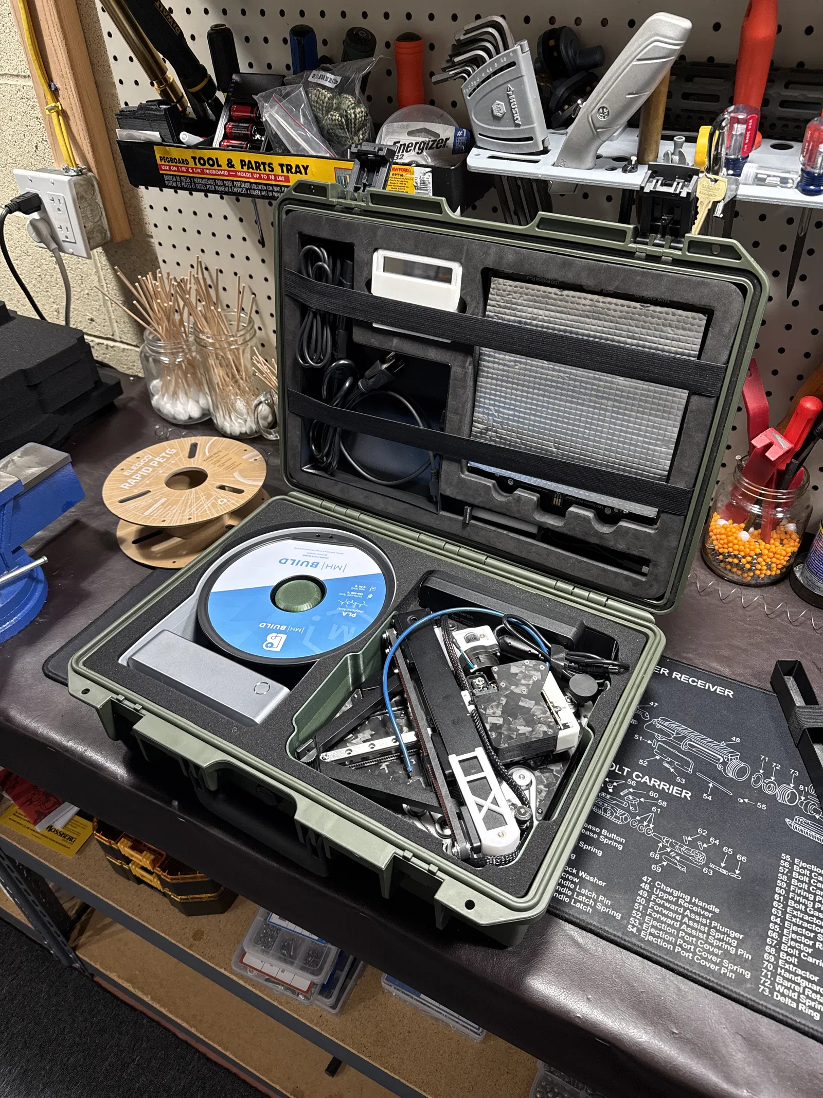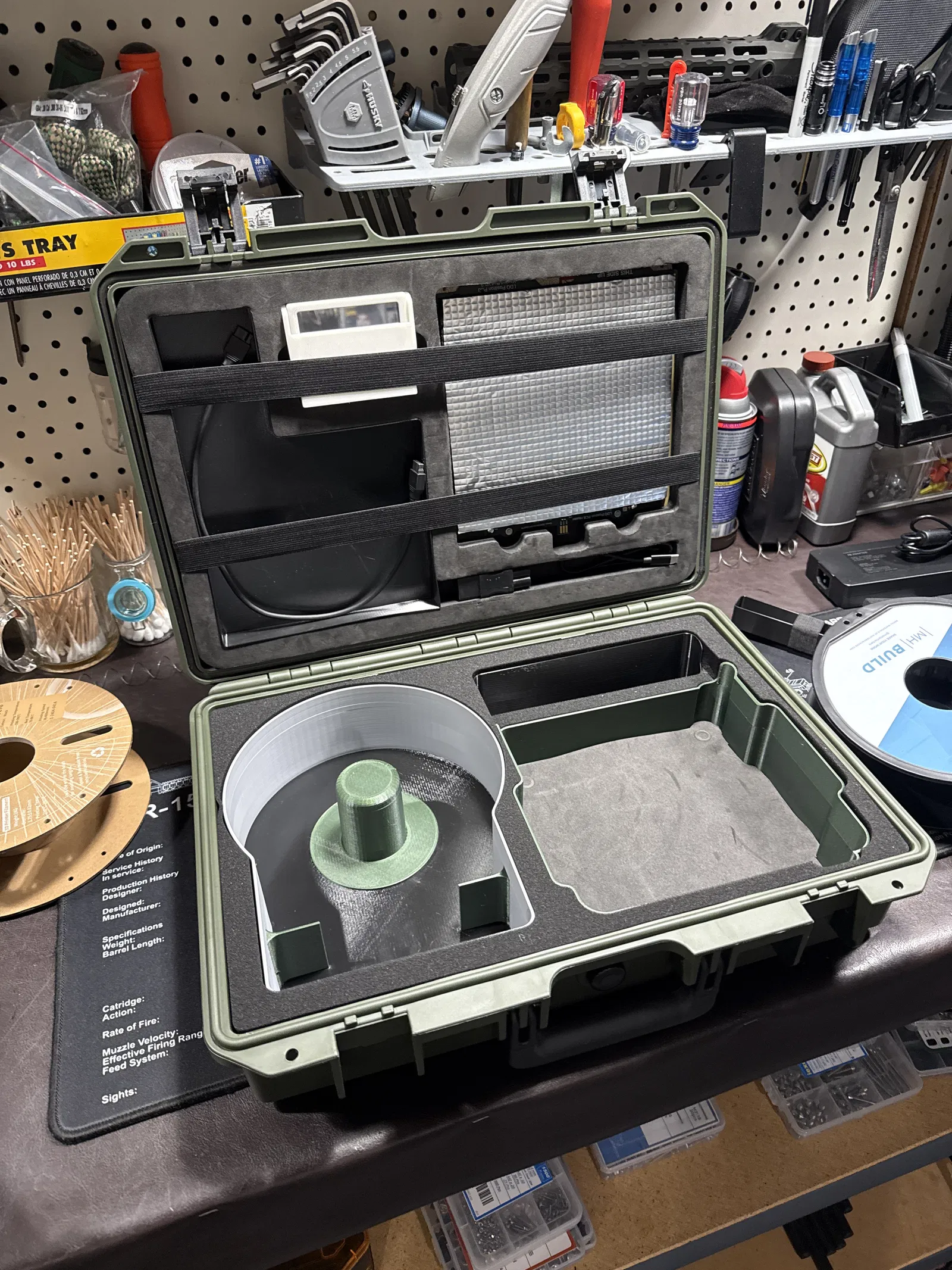 Bên trong có đủ chỗ cho máy in, pin dự phòng Anker Prime, một cuộn nhựa 1kg, màn hình, một đống dây nguồn và một tấm bàn in (build plate).