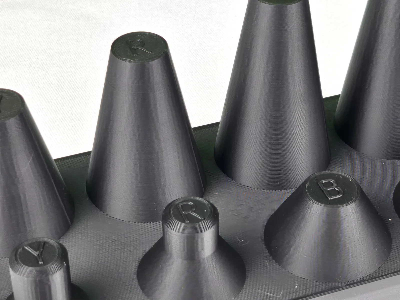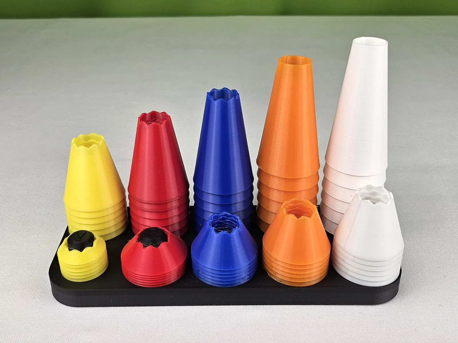 Đây là giá đỡ để lưu trữ và sắp xếp các loại tee chơi golf giả lập mà bạn có thể tìm thấy tại đây: . Mình đã in bằng nhựa PLA và không cần dùng đến support. Phần đầu của mỗi cọc đỡ đều có đánh dấu màu sắc. Mọi người hãy in các kích thước tee khác nhau bằng những màu này nhé: 1. Vàng: 250 & 1625. 2. Đỏ: 500 & 2000. 3. Xanh dương: 750 & 2375. 4. Cam: 1000 & 2750. 5. Trắng: 1250 & 3125. Nếu thích thiết kế này, đừng quên nhấn Like và chia sẻ thành quả in (Makes) của bạn nhé! Fore!