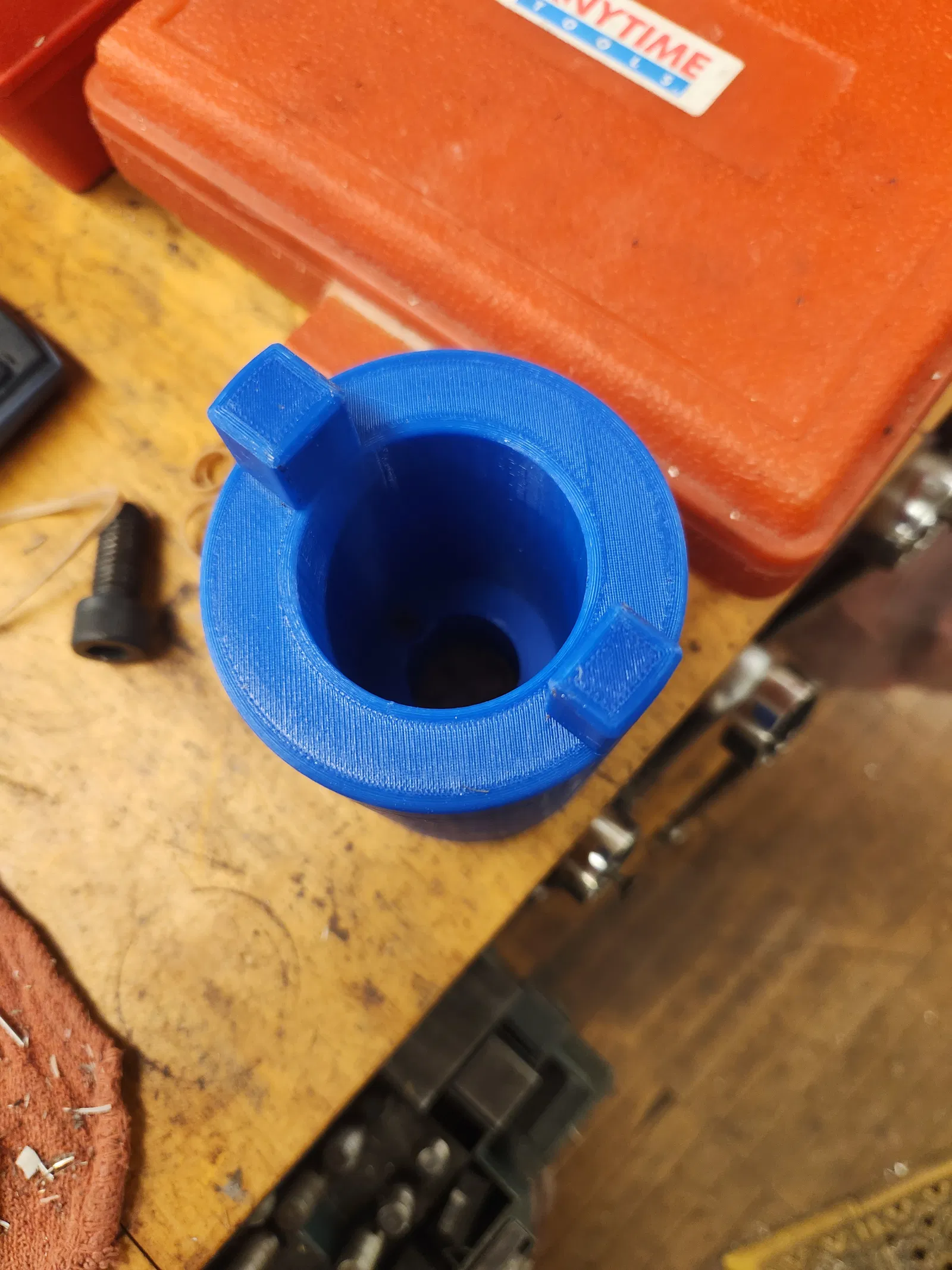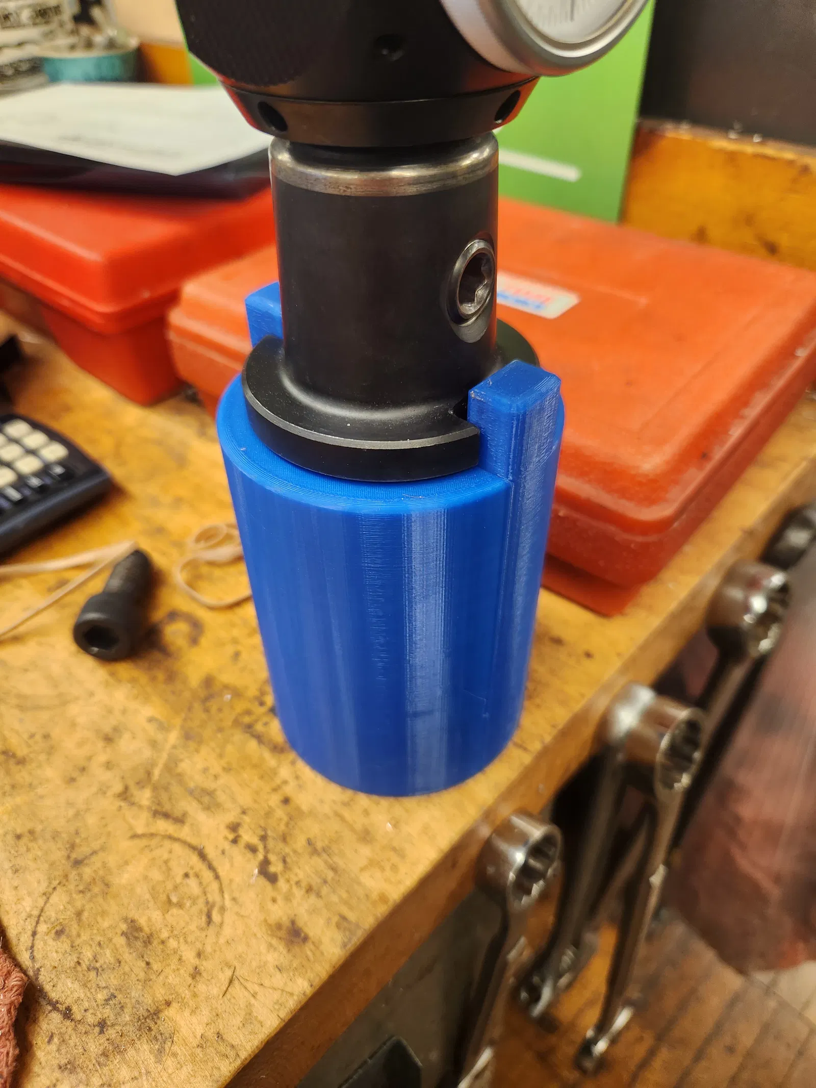 Mình thiết kế cái này để có chỗ để cố định đầu kẹp dao cụ có gắn đầu dò Haimer. Mẫu này được thiết kế cho loại đầu kẹp 40 NMTB nhưng cũng dùng tốt cho các loại đầu kẹp chuẩn CAT hoặc BT 40. Đồng nghiệp của mình đã in thử bằng nhựa gia cường sợi carbon và dùng nó để siết hoặc nới lỏng các đầu kẹp ER 16, nhưng mình không khuyến khích việc này cho nhu cầu sử dụng phổ thông trong xưởng. Phần đế có 2 lỗ để bắt vít cỡ #8 hoặc vít 4mm. Mình tận dụng 2 con vít thạch cao 2 inch có sẵn ở nhà để bắt vào thôi.