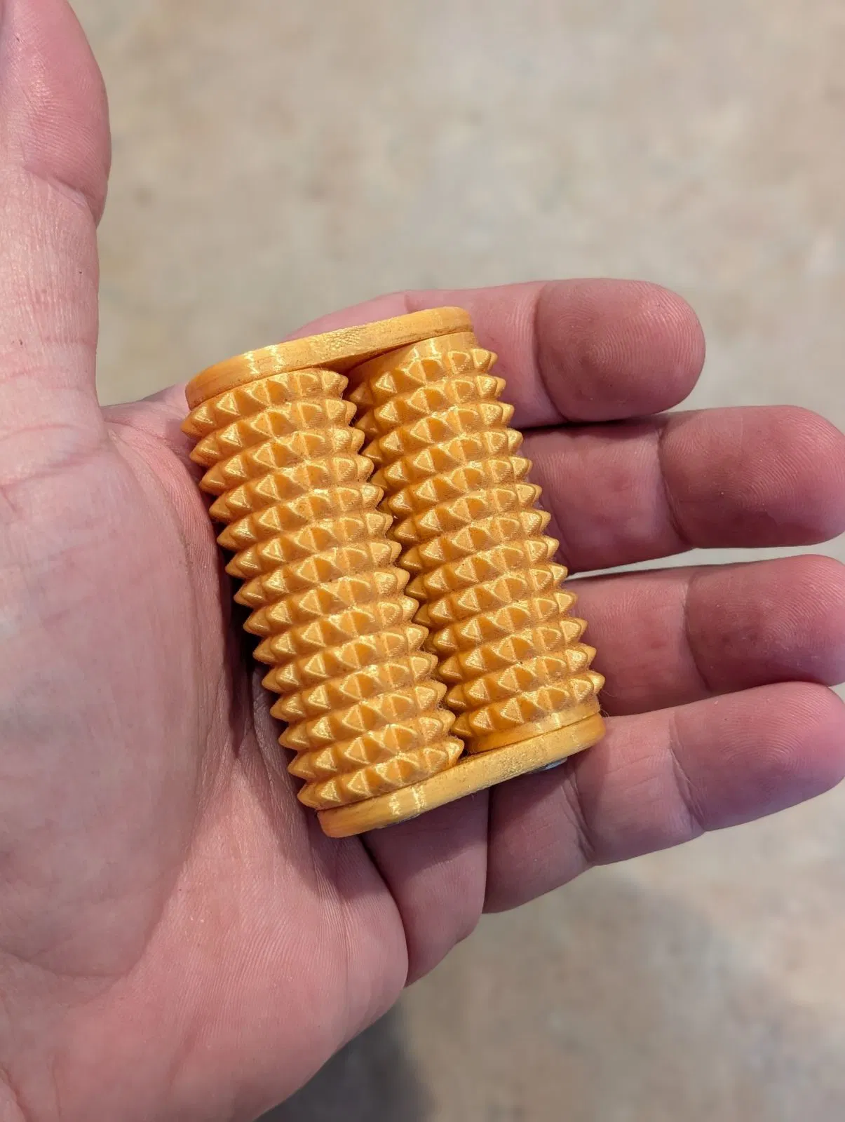 Dụng cụ hỗ trợ cảm giác giúp thư giãn bằng cách lăn trong lòng bàn tay. Các đầu gai tạo áp lực vừa phải, dễ chịu. Mẫu thiết kế riêng, in tốt với PLA, yêu cầu thêm ốc vít để lắp ráp. File 3MF đã được tối ưu cho Prusa Mini+.