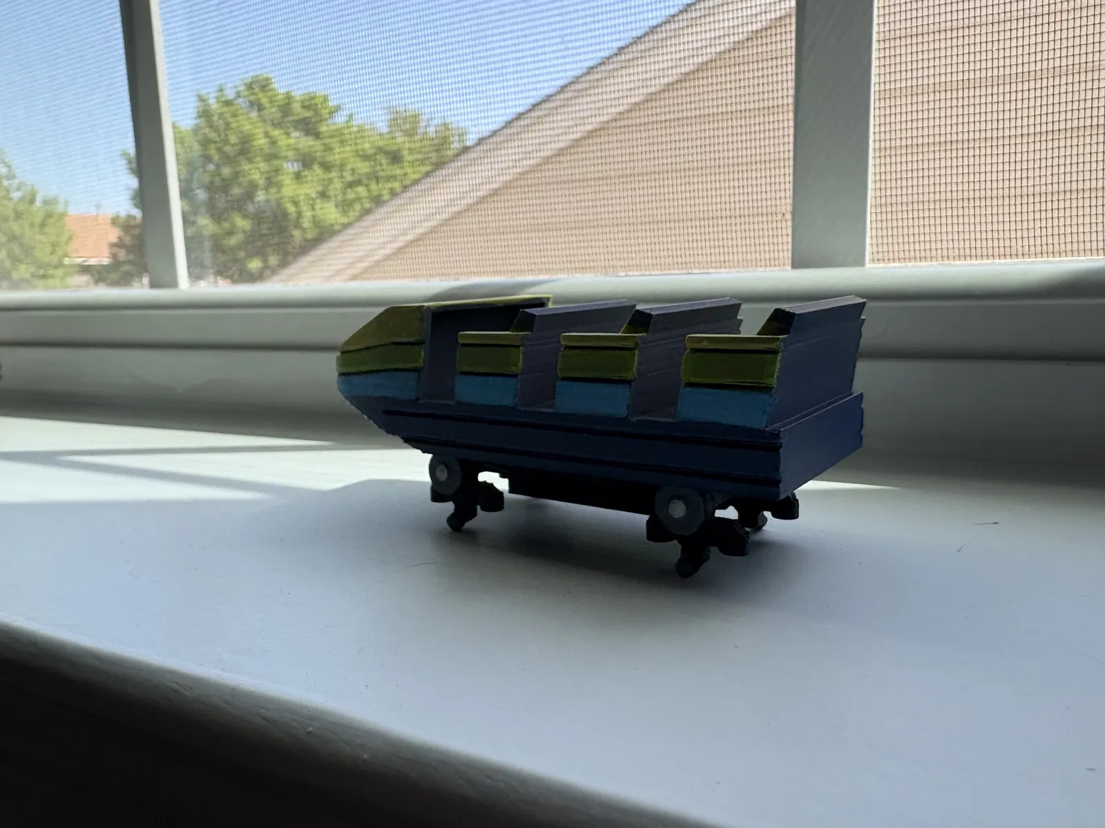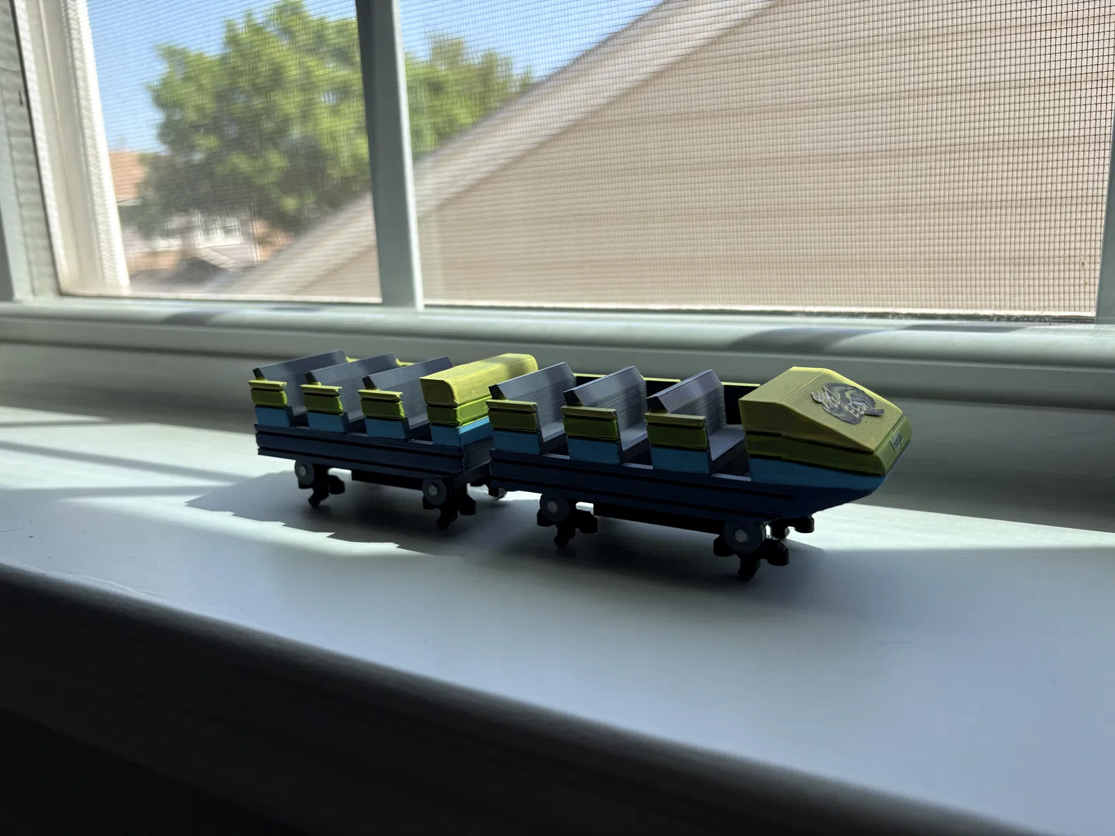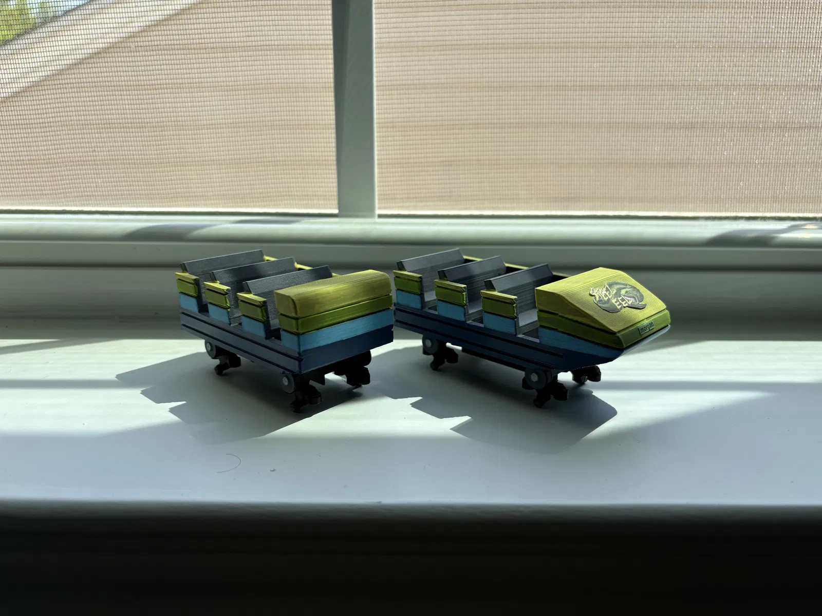 Bạn sẽ cần in một đoạn đường ray, một toa tàu phía trước, một toa giữa, hai giá đỡ và hai cụm bánh xe. Hãy sử dụng keo dán nhanh (CA glue) để gắn các giá đỡ vào đường ray, cũng như gắn các toa tàu vào cụm bánh xe tương ứng của chúng.