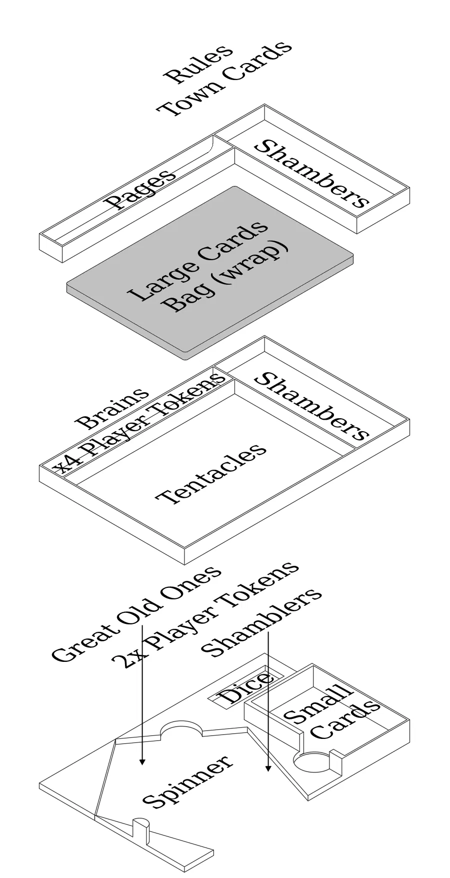 Khay đựng (insert) cho game Tiny Epic Cthulhu bản gốc, không kèm các bản mở rộng và không dùng bọc bài (sleeves). Mình muốn tạo ra một thiết kế trực quan và tiện dụng hơn so với mẫu hiện có tại . Do hộp game này khá khó để sắp xếp gọn gàng nên mình không chắc là thiết kế này đã hoàn hảo chưa, nhưng hy vọng nó sẽ hợp ý các bạn hơn.