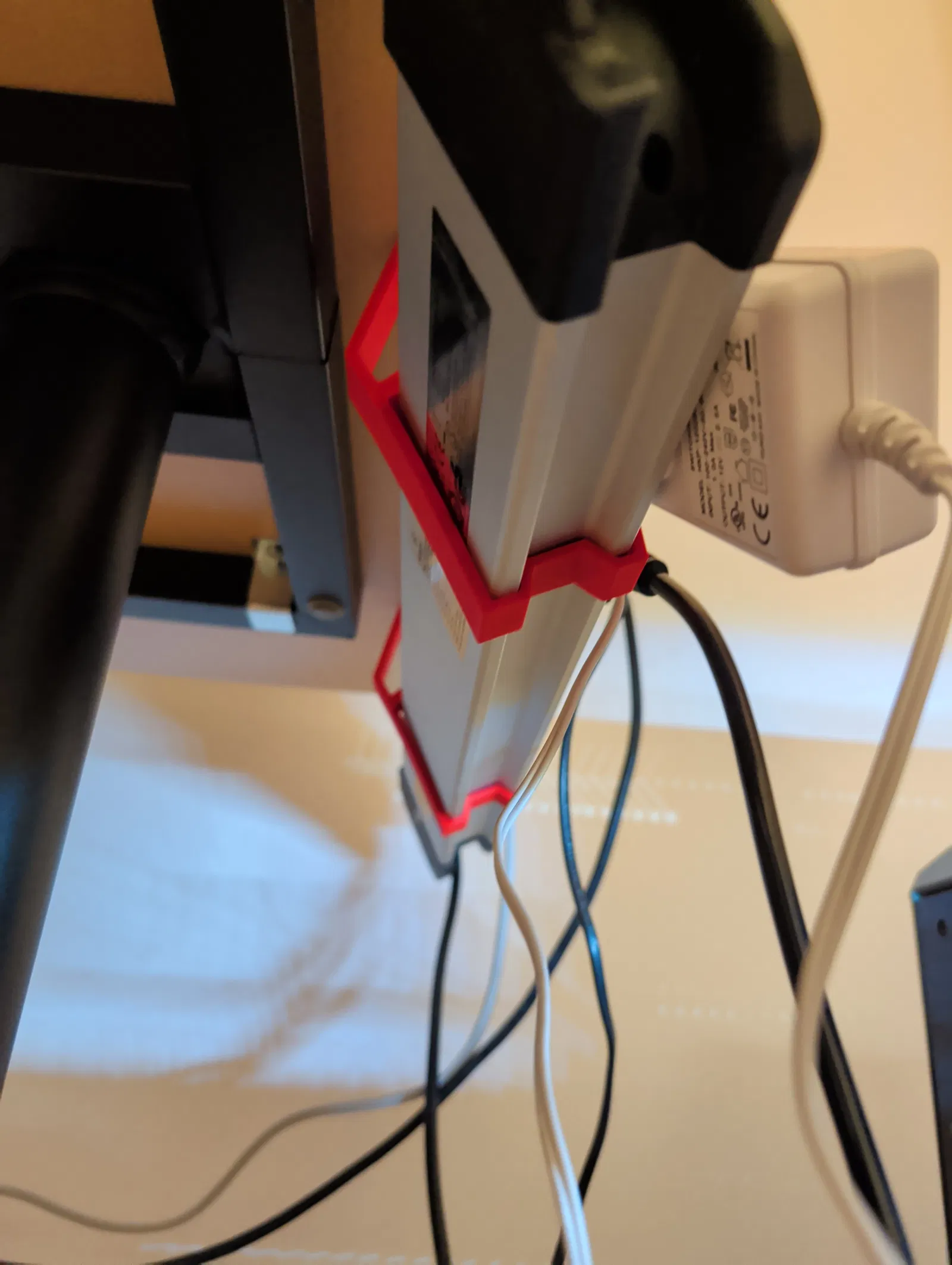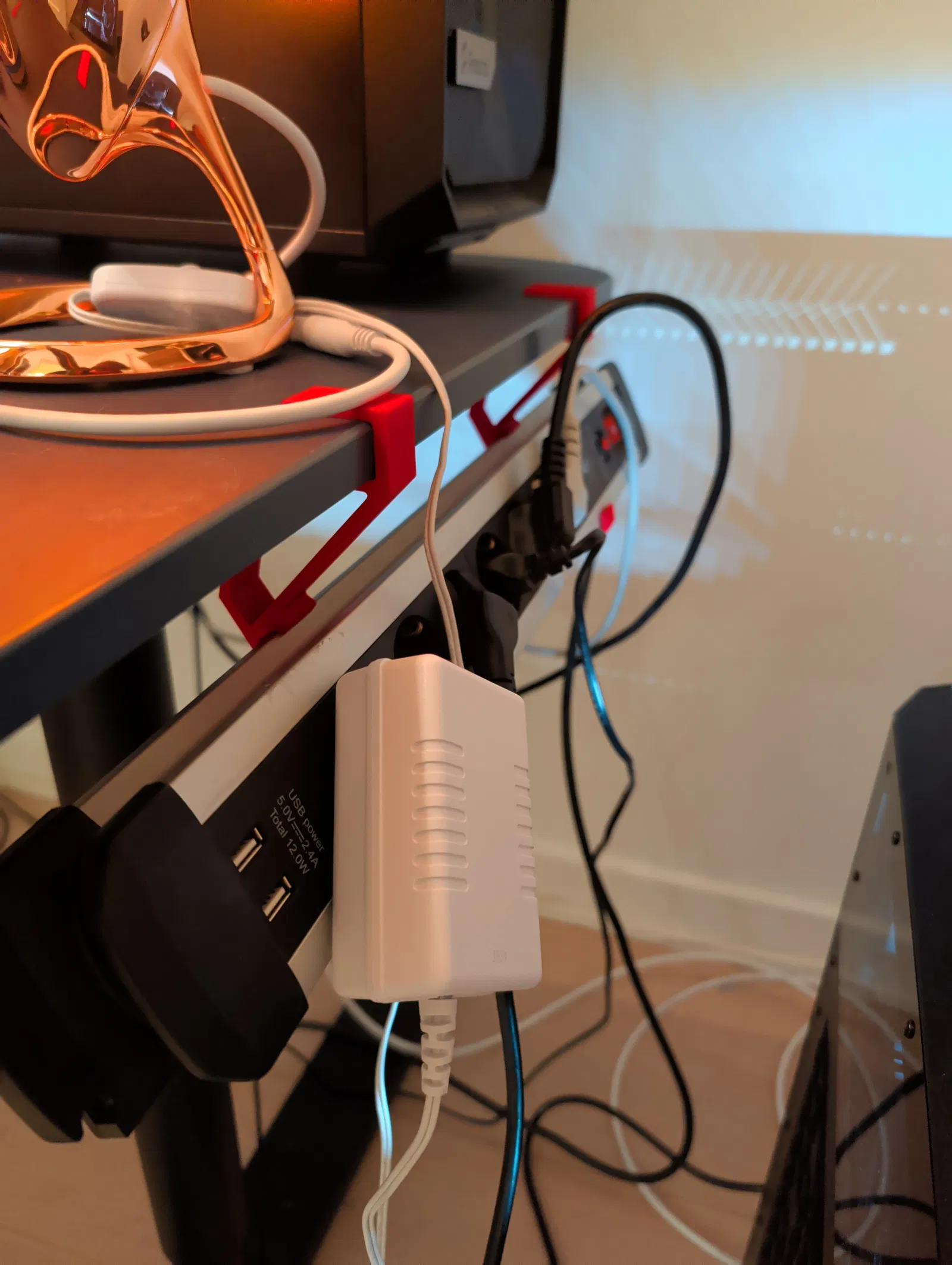 Đây là một chiếc đế kẹp bàn đơn giản được thiết kế để gắn chặt vào ổ cắm điện/chống sét lan truyền này của Clas Ohlson. Xin lỗi mọi người vì tình trạng dây nhợ hơi lộn xộn, đây mới chỉ là bước đầu tiên để mình sắp xếp lại cho gọn gàng hơn. Mình khuyên các bạn nên in hai cái như trong hình để ổ cắm được cố định chắc chắn hơn. Nếu muốn, các bạn cũng có thể điều chỉnh kích thước trong phần mềm slicer để kéo rộng đế kẹp ra cho phù hợp với nhu cầu nhé.