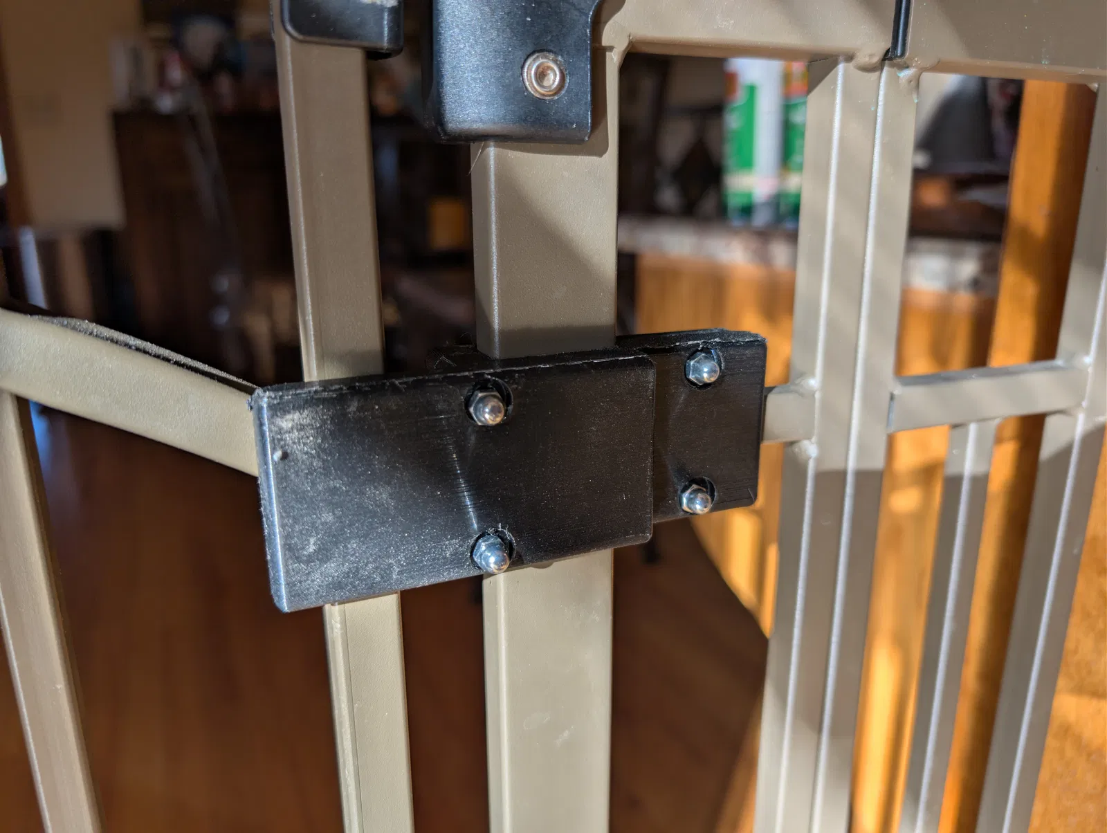 Cái chặn cũ trên cổng kim loại của mình bị gãy nên mình đã tự thiết kế và in lại cái mới. Món này dành cho loại cổng chặn trẻ em mà mình cũng hay thấy mọi người dùng để chặn thú cưng. Mình đã phải chỉnh sửa thiết kế một chút để né mấy mối hàn mà lúc đầu mình không để ý là có trên khung cổng.