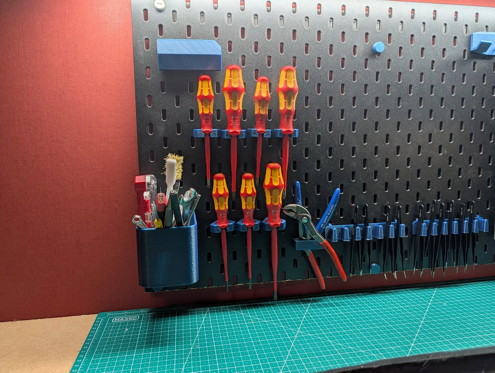 Thiết kế này tập trung vào sự tinh gọn và tính tùy biến cao, cho phép bạn tự do sắp xếp vị trí các cây tua vít Wera yêu thích trên bảng IKEA SKADIS tùy theo thói quen sử dụng cá nhân. Việc treo rời từng chiếc giúp bạn dễ dàng lấy ra và cất vào ngay lập tức mà không cần phải nhấc cả khay lớn hay lục tìm giữa mớ dụng cụ hỗn độn. Đây chính là cách đơn giản nhưng cực kỳ hiệu quả để nâng cấp góc làm việc trở nên chuyên nghiệp và ngăn nắp hơn bao giờ hết.