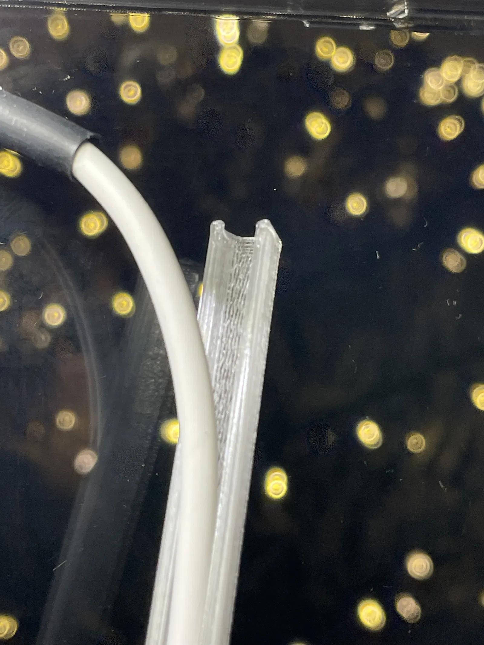 Để đi dây cho dải đèn LED 4 mm (trong tủ kính trong suốt cho máy in Prusa ;-)), mình muốn cố định các sợi cáp sao cho thật thẳng hàng. Mình đã in chúng bằng nhựa PETG trong suốt.