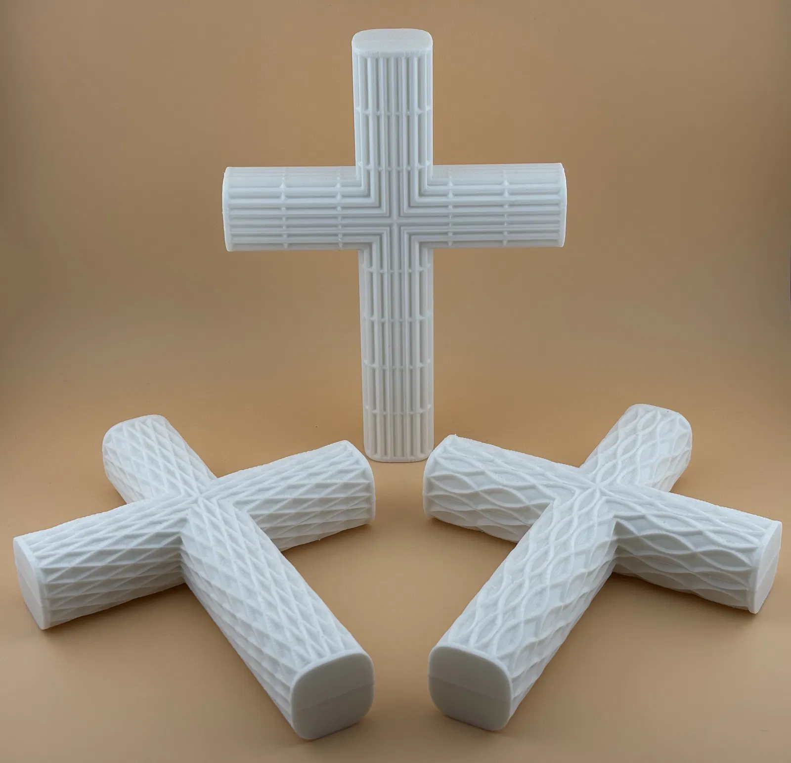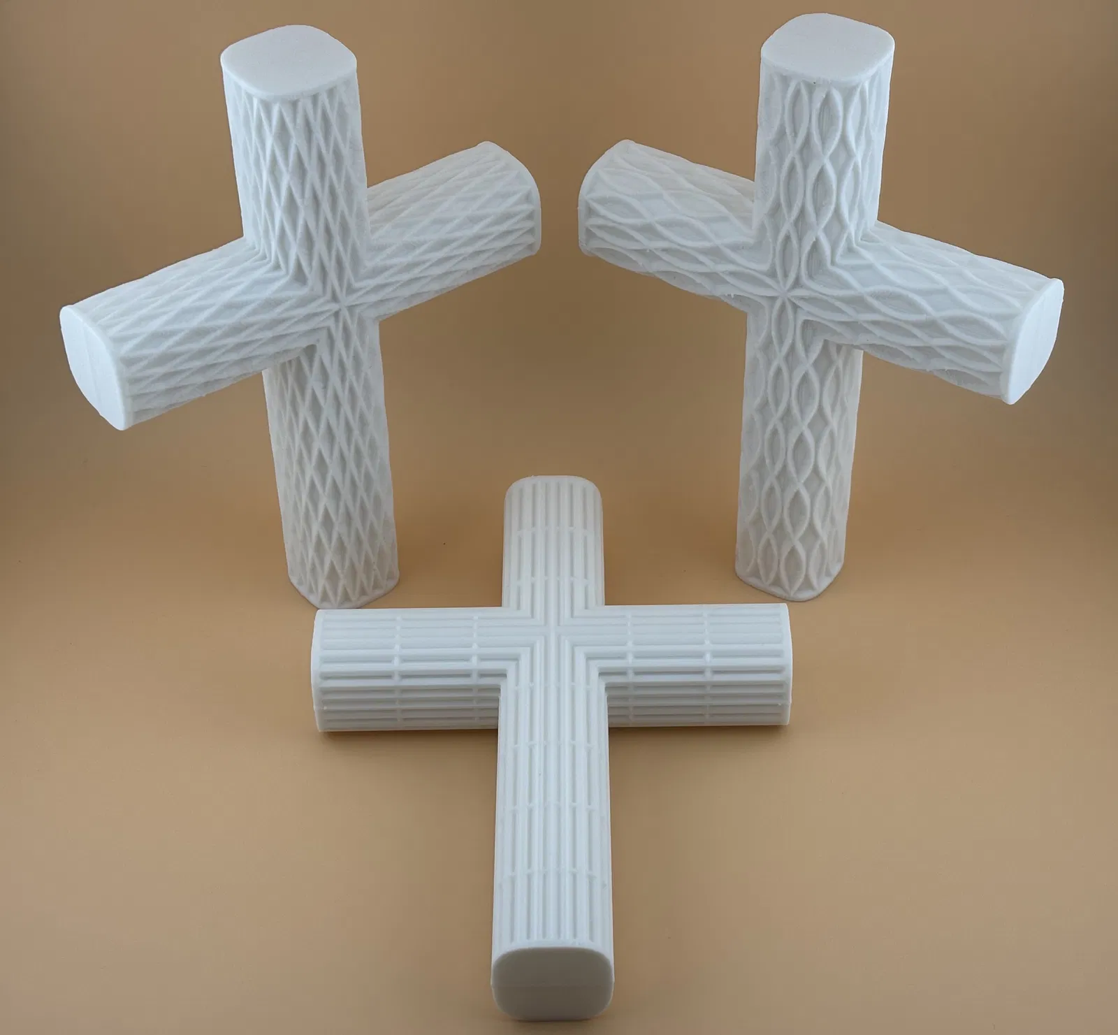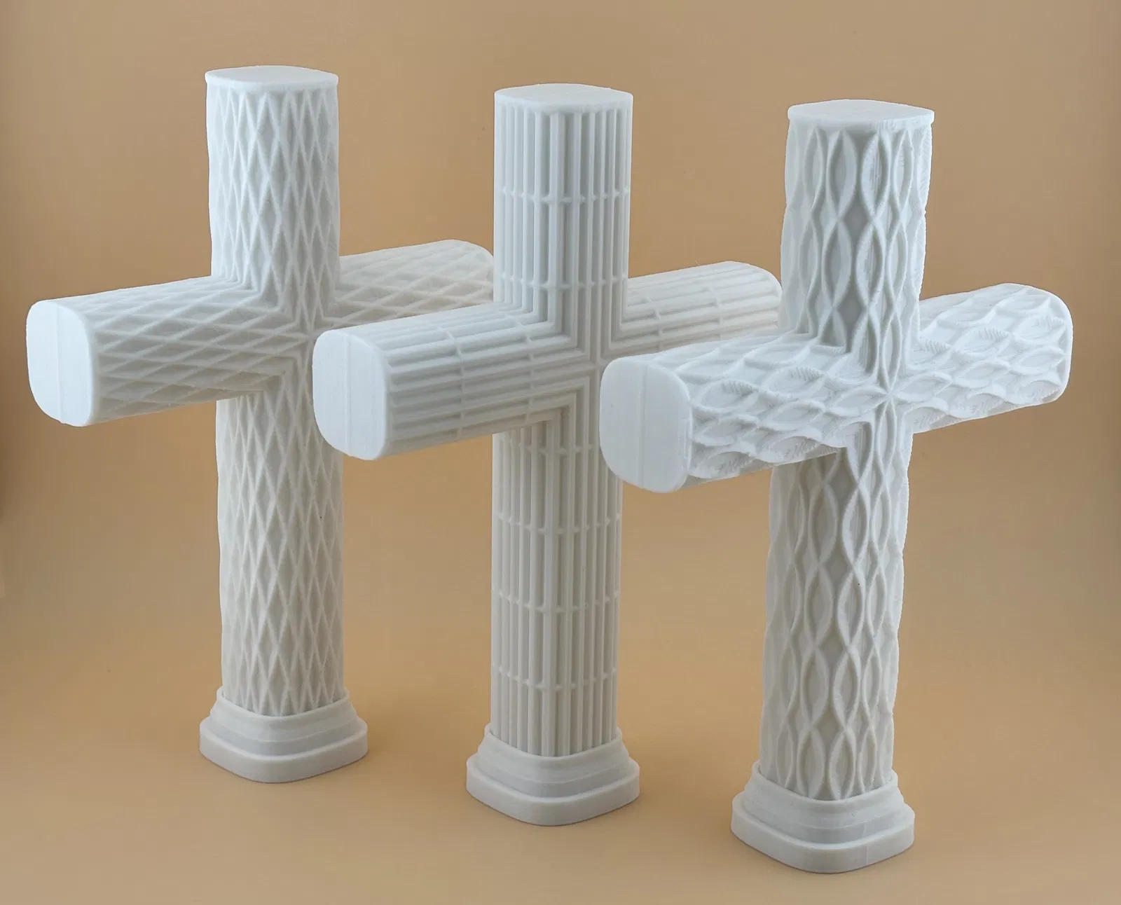 Bộ thánh giá 3D này sở hữu những họa tiết hình học hiện đại đầy ấn tượng: ♦ kim cương, ⊞ lưới, và hai kiểu họa tiết ⌇ gợn sóng. Bốn mẫu thiết kế này làm nổi bật những đường nét sắc sảo cùng bề mặt có kết cấu độc đáo. Mỗi kiểu thánh giá có thể in dạng khối đặc hoặc dạng hai mảnh để treo tường. Sản phẩm đi kèm một đế nhỏ giúp thánh giá đứng vững hơn. Đây là lựa chọn lý tưởng để làm đồ trang trí, quà tặng ý nghĩa hoặc vật phẩm trưng bày dịp lễ Phục sinh. Các hoa văn này bắt sáng rất tốt và cũng rất dễ in. Bộ sản phẩm này mang lại vẻ ngoài đồng bộ nhưng vẫn giữ được nét riêng biệt cho từng loại bề mặt.
