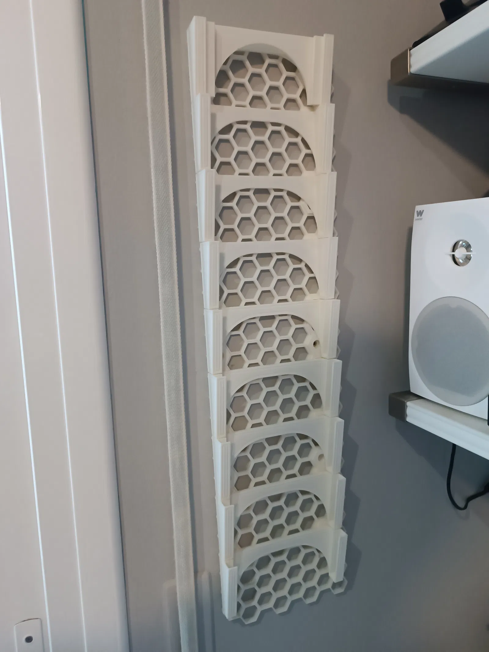 Đây là một hệ thống lưu trữ đĩa CD tiện lợi dựa trên Honeycomb storage wall, rất dễ dàng và nhanh chóng để in ấn. Mỗi phần gắn tường có thể chứa tối đa 3 chiếc CD. Ngoài ra, mình cũng đã thêm một phần "bộ chuyển đổi" (reduction) để bạn có thể gắn các loại hộp đựng dạng túi mỏng, thường dùng cho đĩa CD Single.