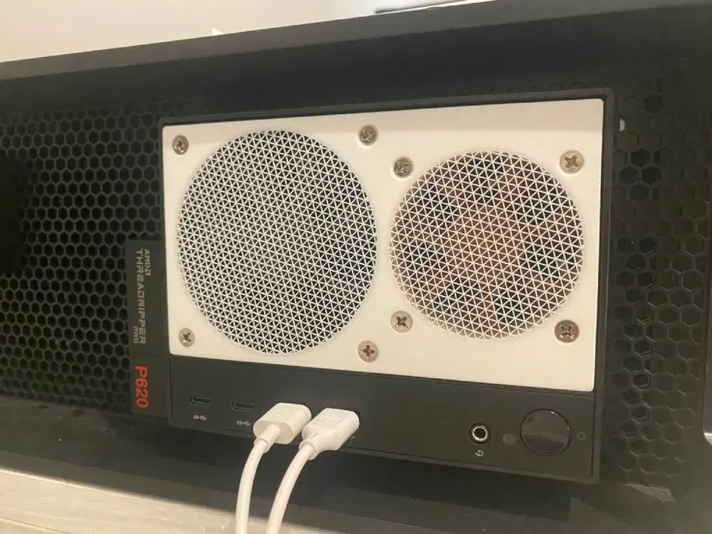 Khung gắn quạt chuyên dụng cho khay ổ đĩa mặt trước của ThinkStation P620, cho phép lắp linh hoạt 1 quạt 80mm và 1 quạt 60mm. Thiết kế tối ưu cho việc in 3D với nhựa PLA, hỗ trợ tùy chỉnh tấm lọc gió để tăng cường hiệu quả làm mát cho máy.