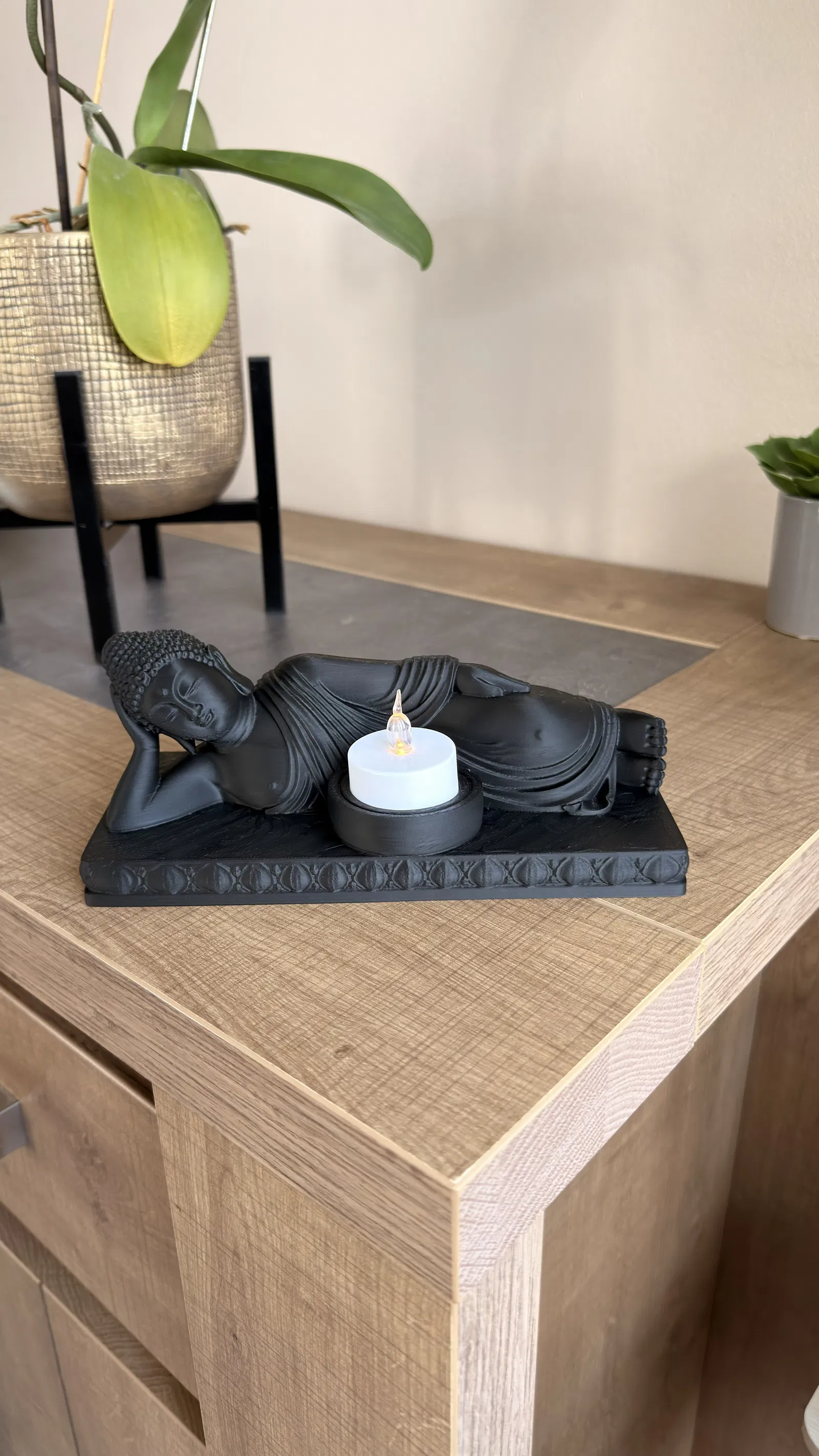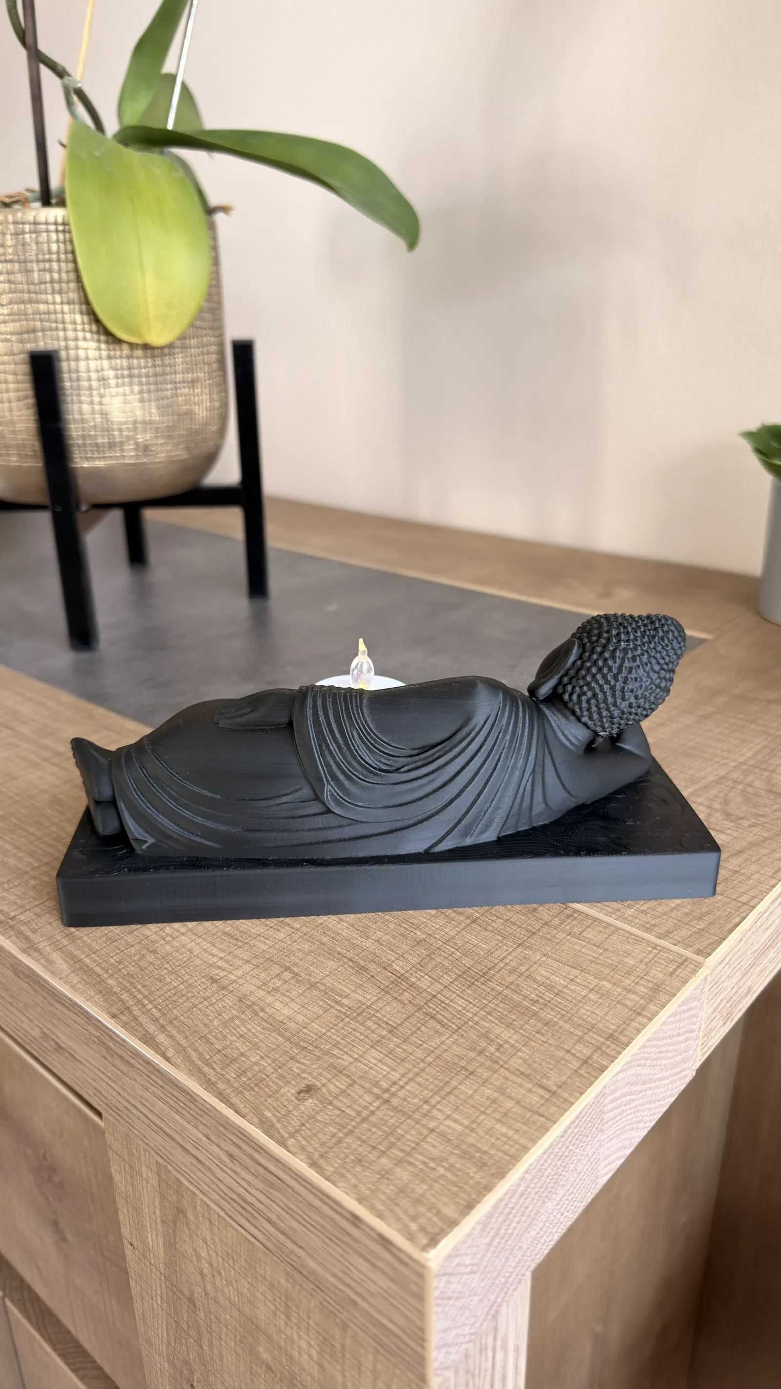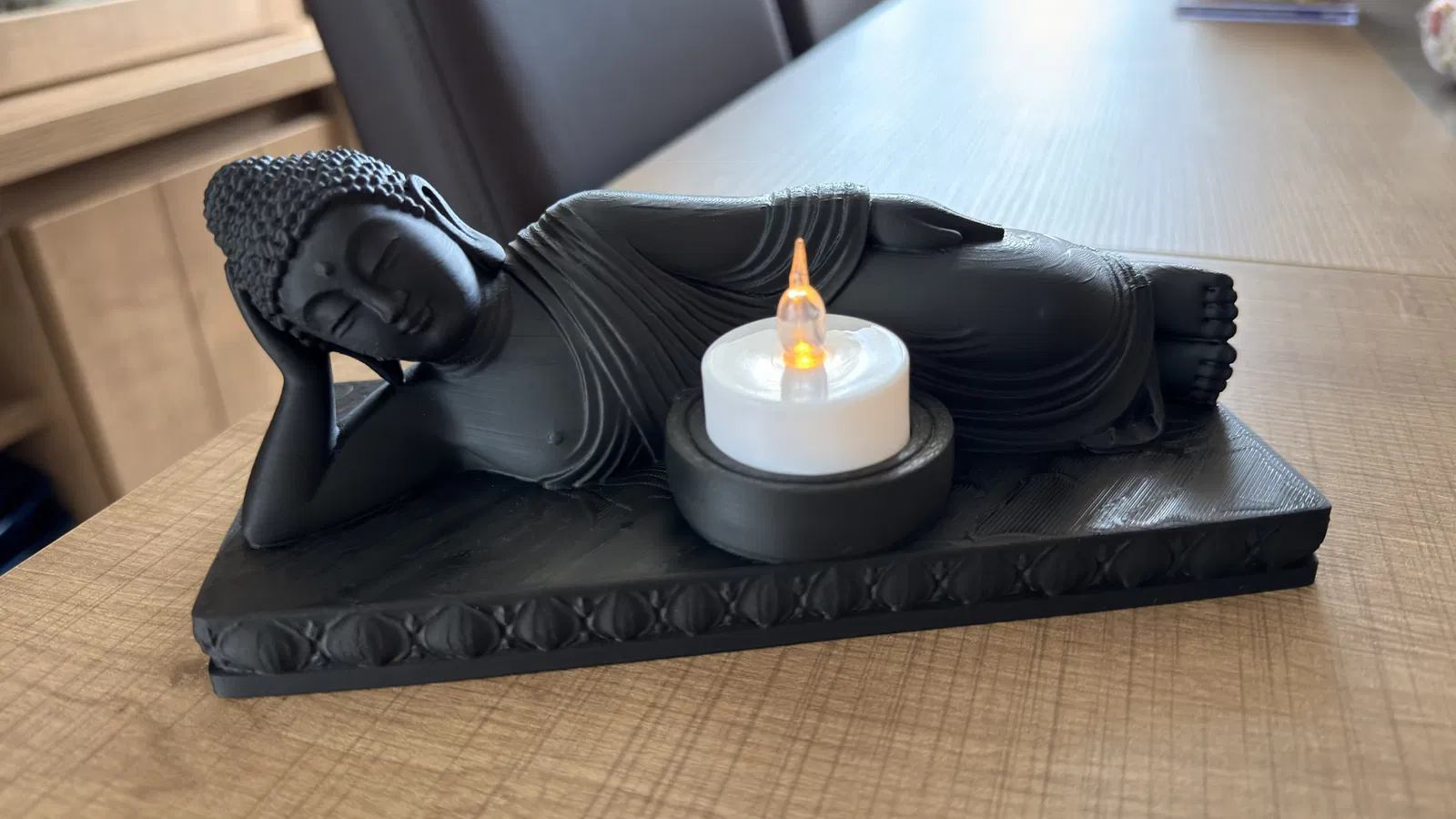 Một mẫu tượng Phật nằm thanh tịnh được thiết kế làm đế cắm nến LED, mang lại vẻ đẹp thư thái cho không gian thiền hoặc trang trí nội thất của bạn. Sản phẩm dễ in, phù hợp với nến trà LED tiêu chuẩn và tạo không gian Zen an nhiên.