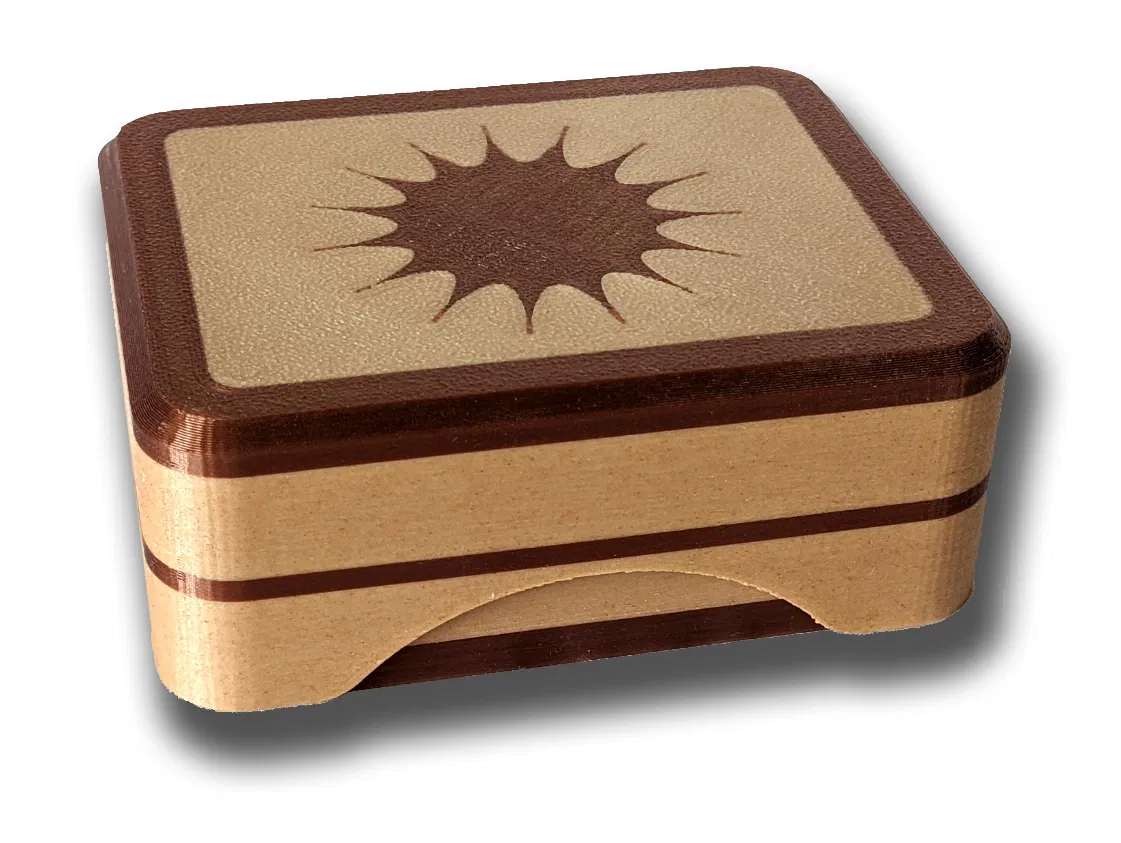 Chiếc hộp đa sắc của mình được in bằng PLA Woodfill và PLA Copper. Chất liệu Woodfill mang lại cảm giác cầm nắm rất thích, còn màu Copper tạo nên những điểm nhấn bắt mắt. Phần khay thì mình in bằng PLA Silver Silk.