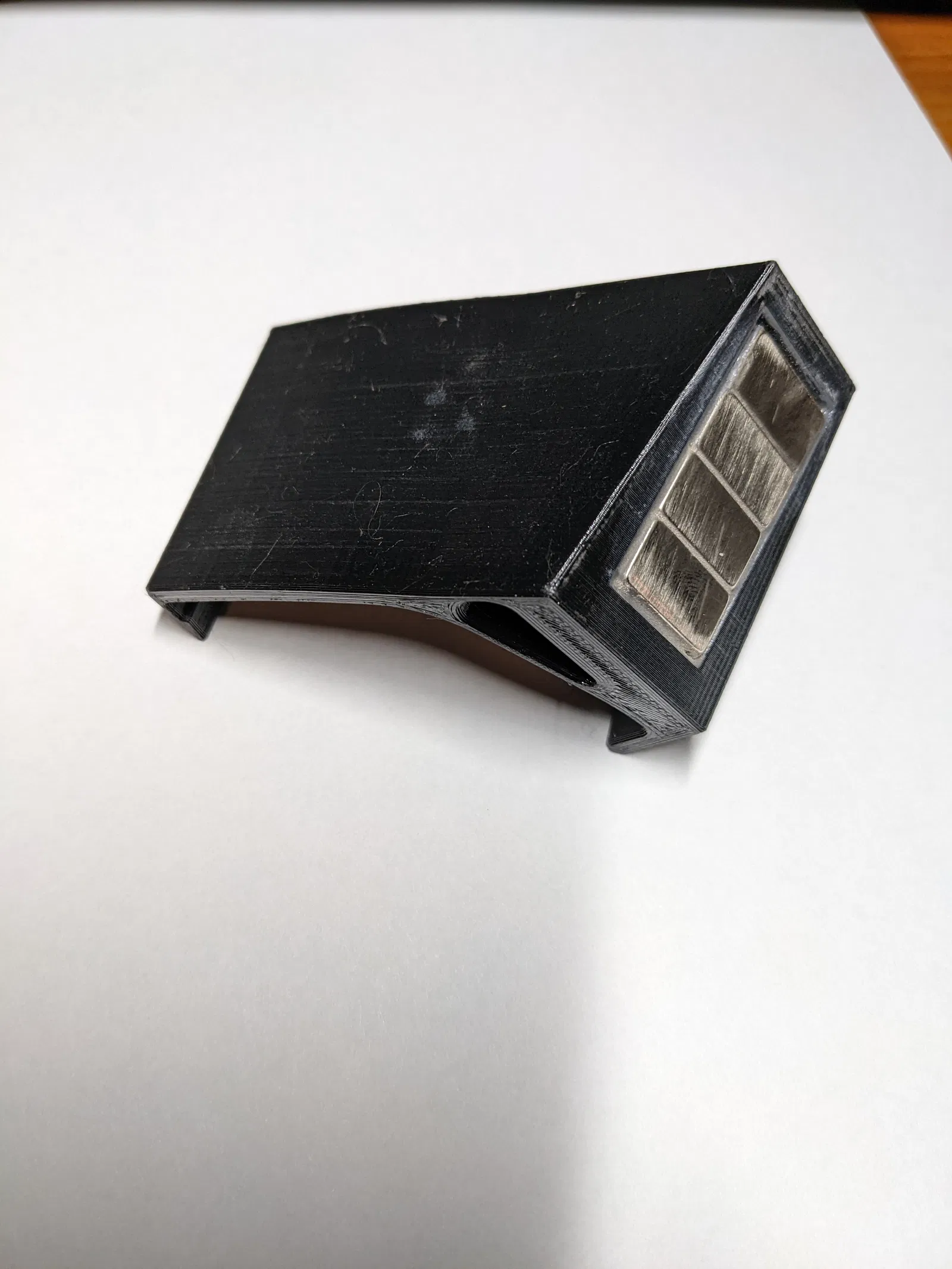 Mình tạo cái giá đỡ này cho chiếc F-350 đời 2013 của mình. Thiết kế có sẵn hốc để gắn 4 viên nam châm neodymium loại BC63 (kích thước 3/4" x 3/8" x 3/16"). Mình đã dùng keo epoxy (JBWeld) để cố định chúng vào vị trí, sau đó dán thêm một miếng cao su có mặt keo lên trên để tạo bề mặt bám dính, giúp điện thoại không bị trượt khi gắn vào. Mình để một miếng kim loại mỏng bên trong ốp lưng TPU của điện thoại để nam châm hút chặt vào.