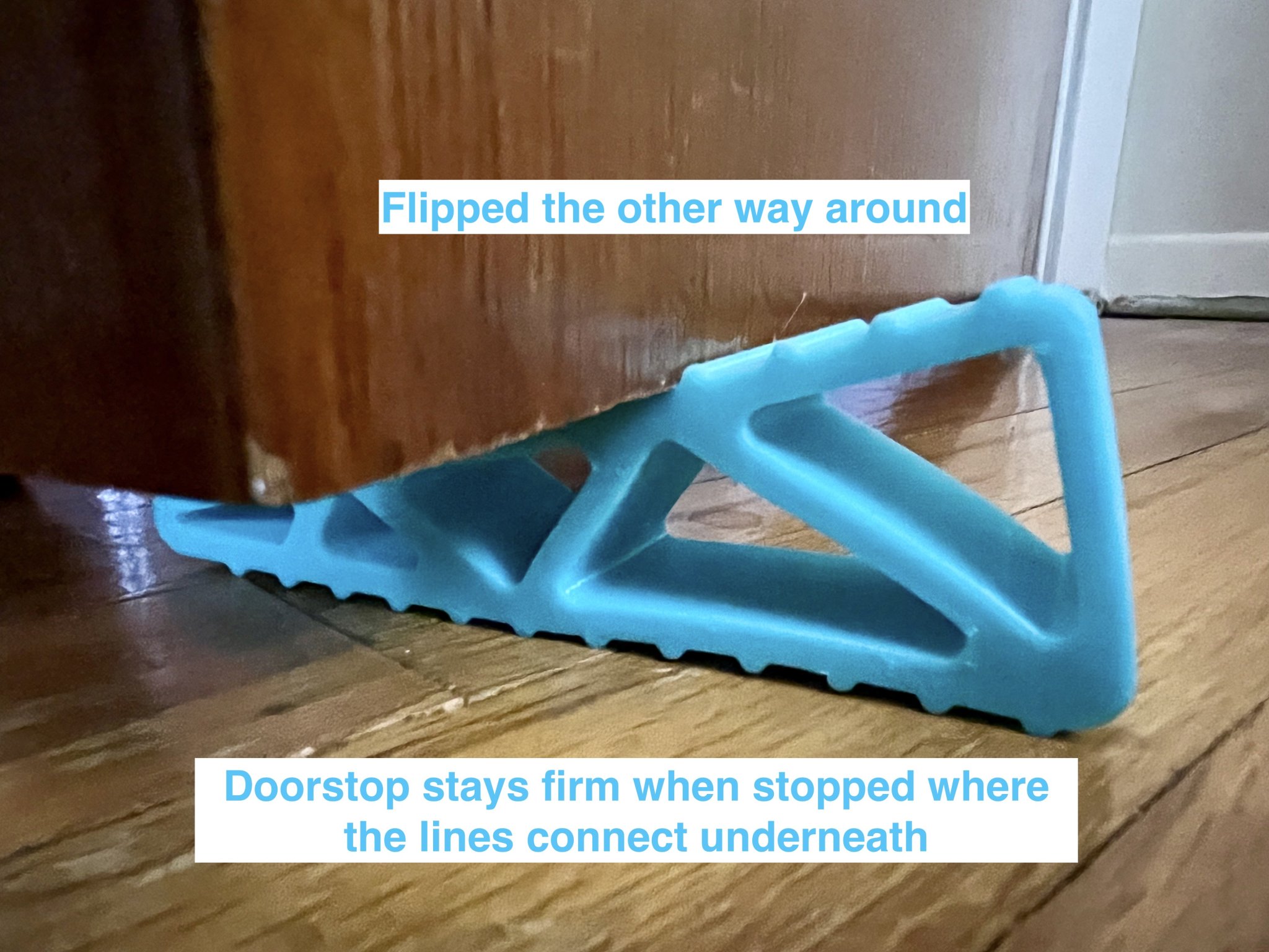 Mô hình này được thiết kế để in bằng TPU. Độ linh hoạt của TPU sẽ mang lại cho cái giữ cửa các tính chất tương tự như cao su, cho phép nó uốn cong và linh hoạt khi bị kẹp dưới một cánh cửa, và đủ mềm để không làm xước cửa hoặc sàn.