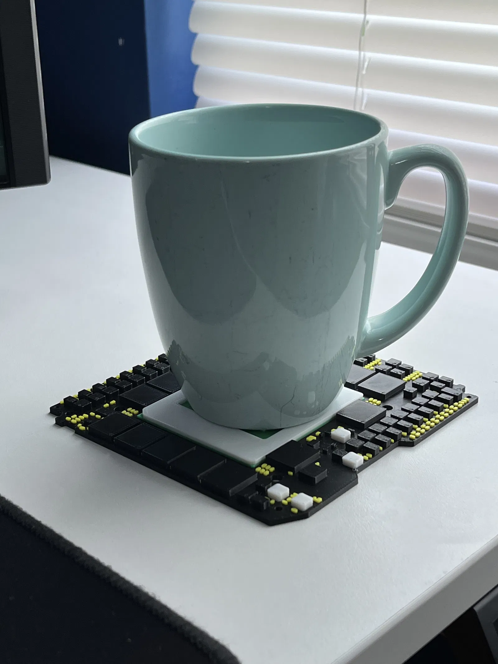 Các linh kiện chính trên bo mạch đều được mô phỏng khá chi tiết, bao gồm cả những điện trở và tụ điện lớn. Riêng phần đầu cắm nguồn đã được lược bỏ để tránh vướng khi đặt ly lớn và giúp việc xếp chồng các miếng lót ly gọn gàng hơn.