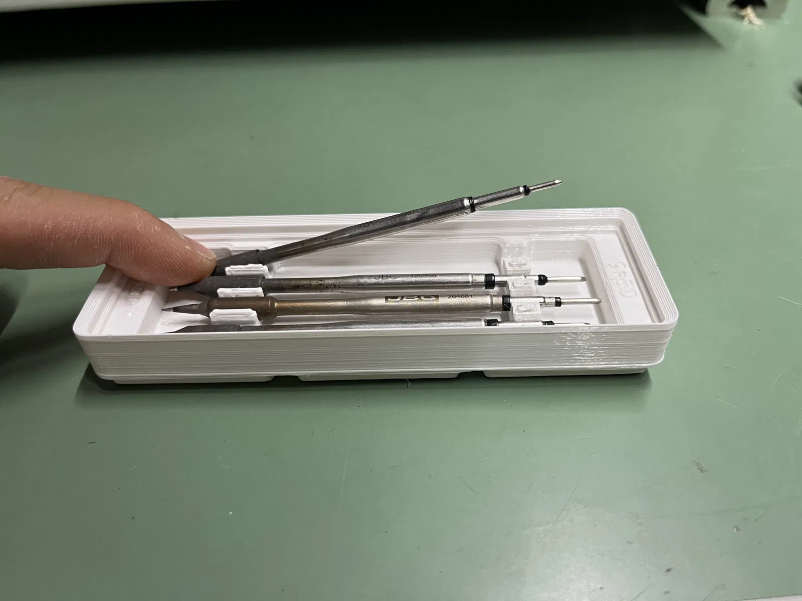 Cái hộp Gridfinity kích thước 3x1x2 này được thiết kế để chứa tối đa bốn mũi hàn JBC C245 hoặc sáu mũi hàn JBC C210 cho trạm hàn của bạn. Mỗi mũi hàn sẽ nằm trong một khe có độ hở vừa phải theo chiều dọc—giúp bạn lấy ra hay đặt vào cực kỳ dễ dàng mà không cần phải cố nhét quá chặt. Thiết kế còn có cơ chế “nhấn để bật” rất thông minh: chỉ cần nhấn nhẹ một đầu của mũi hàn, đầu kia sẽ tự động nhô lên để bạn lấy ra nhanh chóng mà không cần dụng cụ hỗ trợ. Một phụ kiện tuyệt vời để sắp xếp góc làm việc gọn gàng hơn. Hộp tương thích hoàn hảo với các tấm đế Gridfinity 42mm tiêu chuẩn.