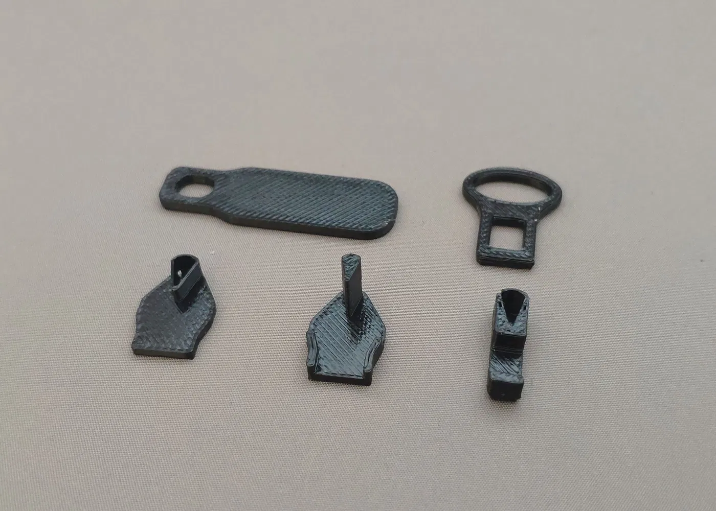 Hướng dẫn in Mình in bằng nhựa PETG với đầu phun 0.4 mm và độ cao lớp in là 0.2 mm. Mình khuyên bạn nên in chậm, khoảng 30 mm/s để đảm bảo độ bền và độ chính xác cao nhất. Lắp ráp Đặt phần đáy bên dưới khóa kéo, sau đó trượt phần trên vào phần đáy ngay trên khóa kéo. Trong lúc giữ chúng lại với nhau, hãy thử kéo khóa lại. Nếu khóa kéo được một đoạn thì việc dán keo cố định sẽ dễ dàng hơn. Nếu việc lắp thử đã khớp, hãy bôi một chút keo vào các điểm kết nối của phần đáy, phần trên và tay cầm. Chú ý đừng để keo dính vào dây khóa kéo. Lắp lại các bộ phận quanh khóa kéo và giữ chặt. Đặt tay cầm khóa lên trên, nhưng đừng quên xỏ cái móc kéo vào trước. Giữ chặt mọi thứ cho đến khi keo khô. Thay đổi Ngày 21 tháng 5 năm 2025: thêm v2 cho cả hai loại móc kéo với lỗ lớn hơn để móc có thể lật được cả hai chiều trên đầu khóa in 3D.