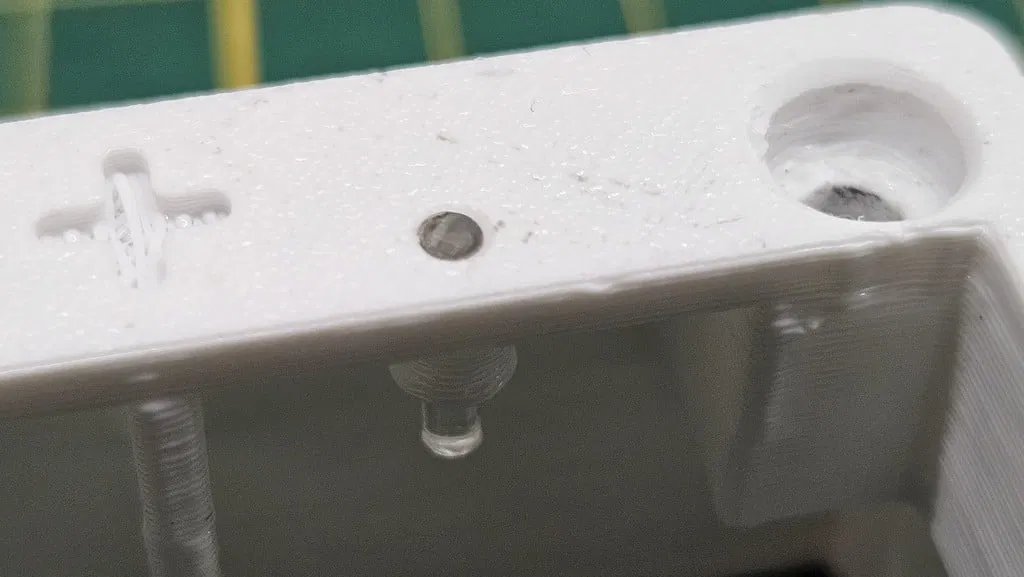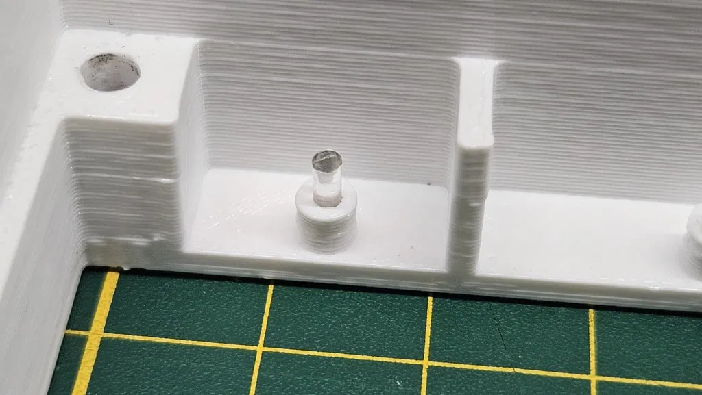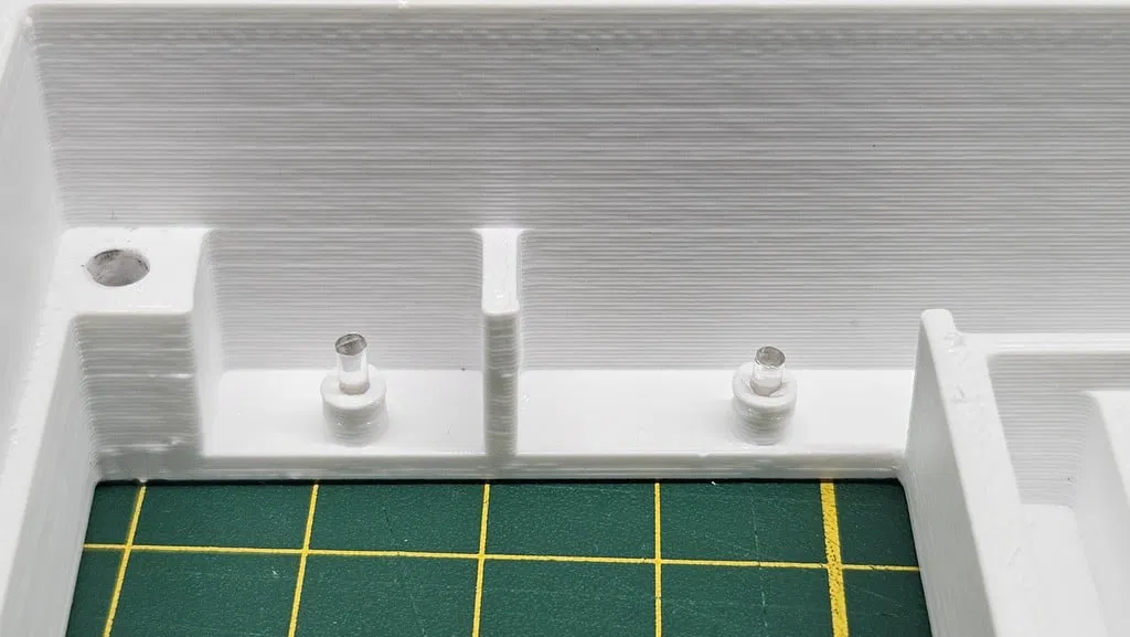 In vỏ hộp và 4 nút bấm. Khoan lỗ cho bộ tán sáng bằng mũi khoan 1.7mm. Cắt bốn đoạn nhựa PETG trong suốt 1.75mm dài 7mm. Nhấn các đoạn PETG này vào các lỗ đã khoan.
