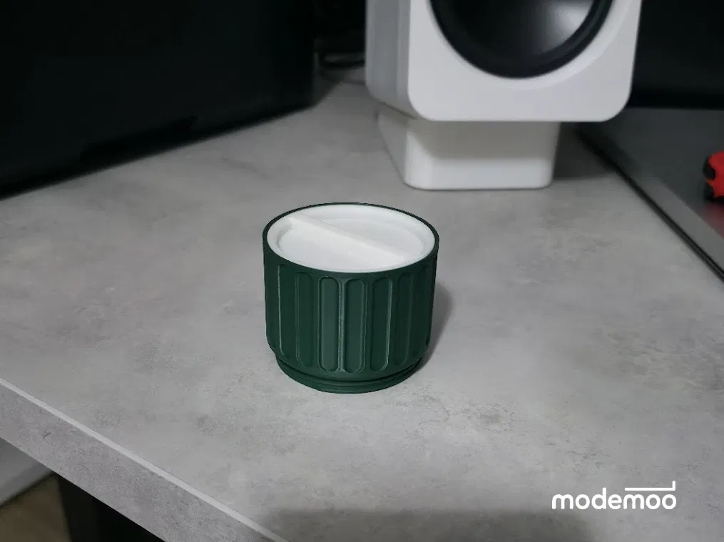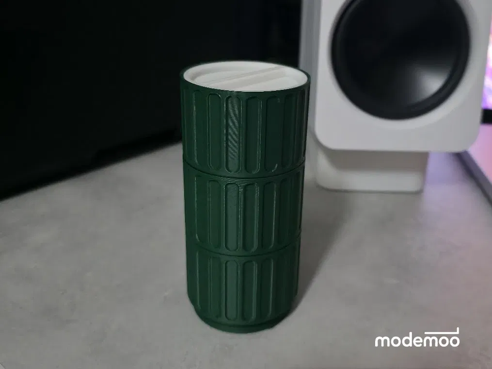 Đây là một hệ thống hộp đựng hình trụ dạng module với các khớp vặn ren ở cả đầu và đáy. Mỗi đơn vị có thể vặn chặt vào đơn vị tiếp theo — không cần nắp, không cần nam châm, chỉ đơn giản là cơ chế xoay để khóa rất gọn gàng.